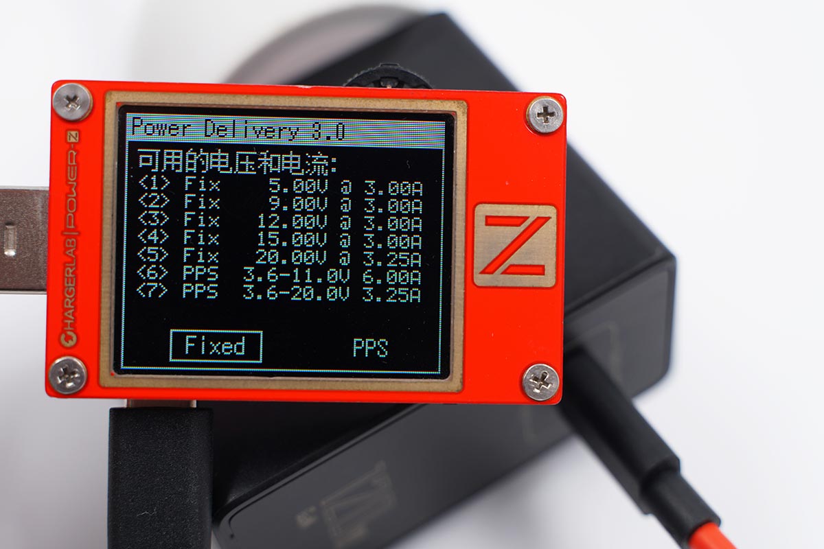 读取充电器的PDO报文,实测支持5V3A、9V3A、12V3A、15V3A、20V3.25A五个全固定电压档位,此外还支持3.6-11V 6A和3.6-20V 3.25A两组PPS快充,也就是说充电器支持最高65W的PD快充功率。