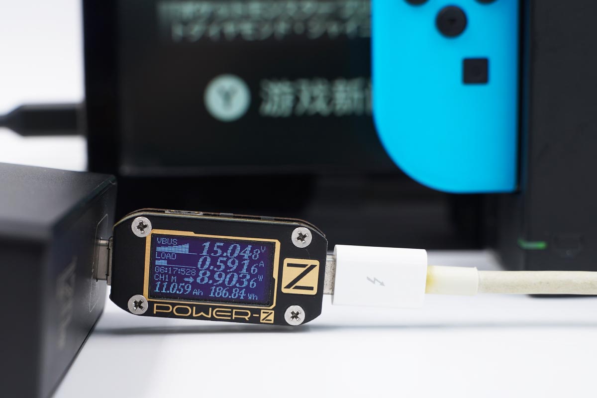 Switch带有特殊的底座TV模式,需要15V3A PDO才可以正常工作,非常挑充电设备。使用充电器为Switch底座供电,功率为15.04V 0.59A 8.90W,成功握手底座TV模式,底座正常对显示屏输出HDMI信号。