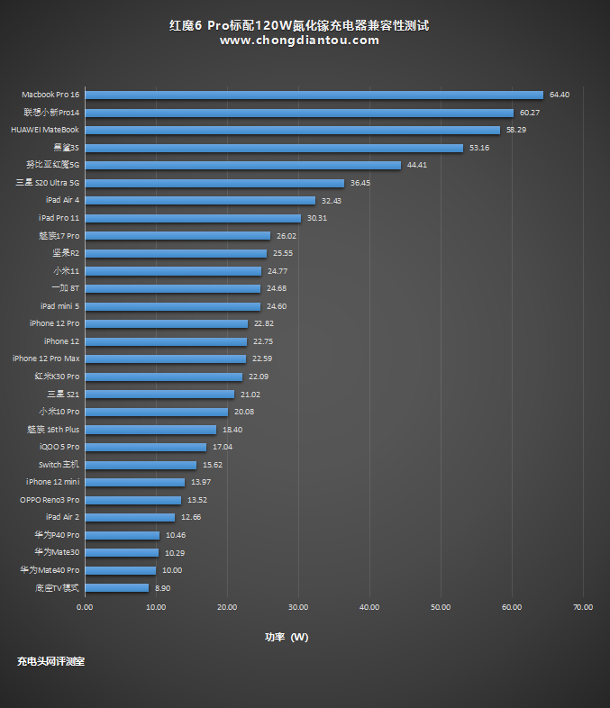从柱状图上来看,16英寸的MacBook Pro充电功率最高,几款支持PPS大功率快充的机型功率在40W-60W左右,剩下几款机型的功率柱状图走向较为平缓。