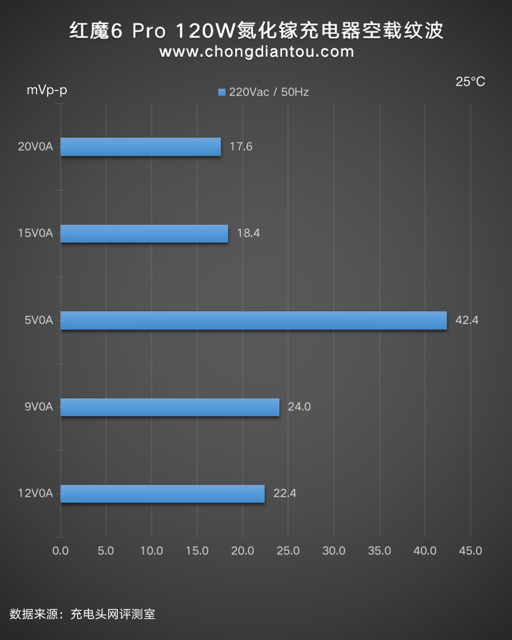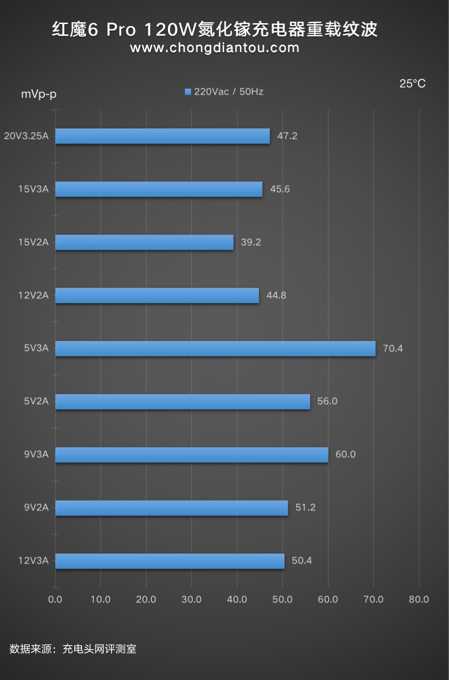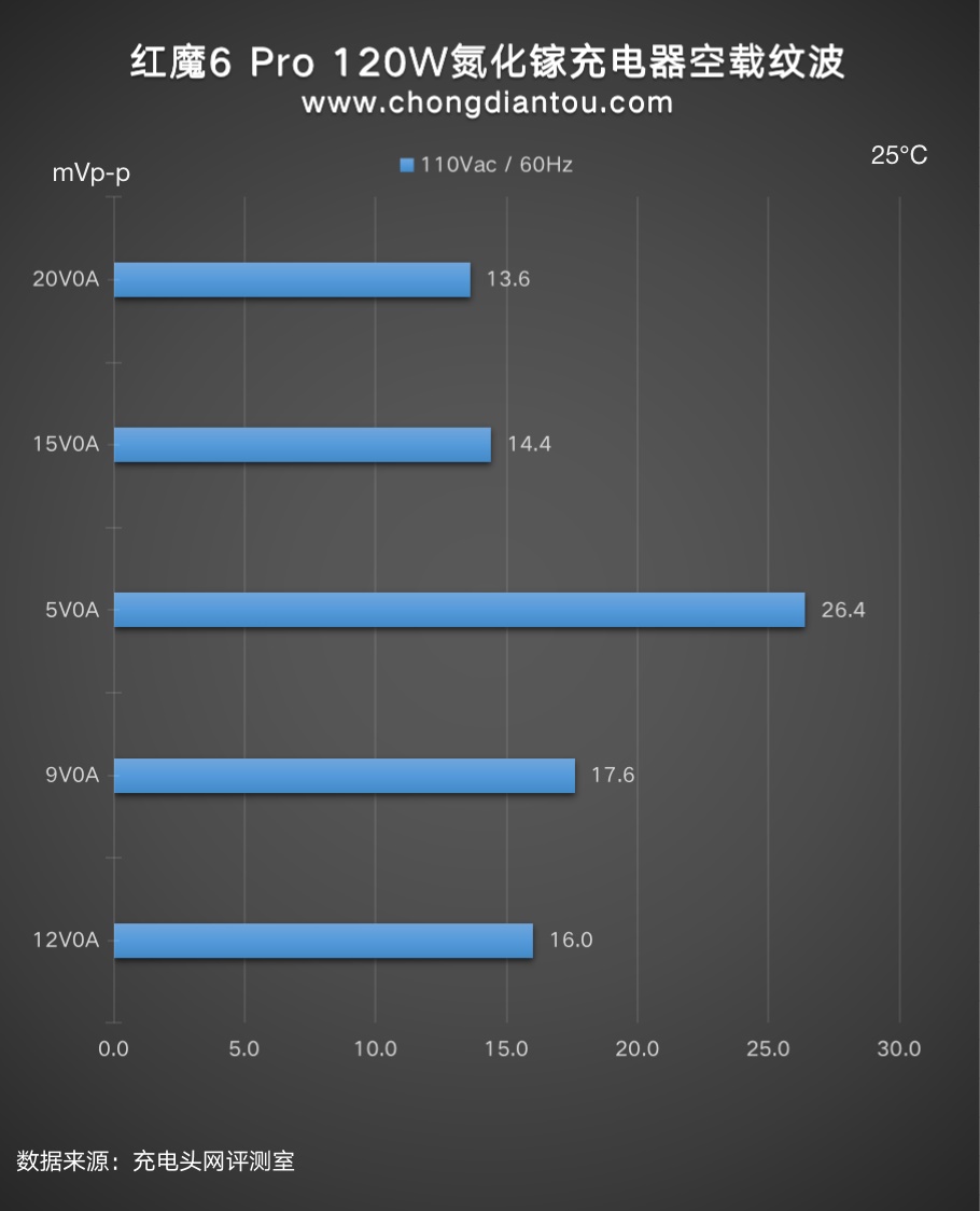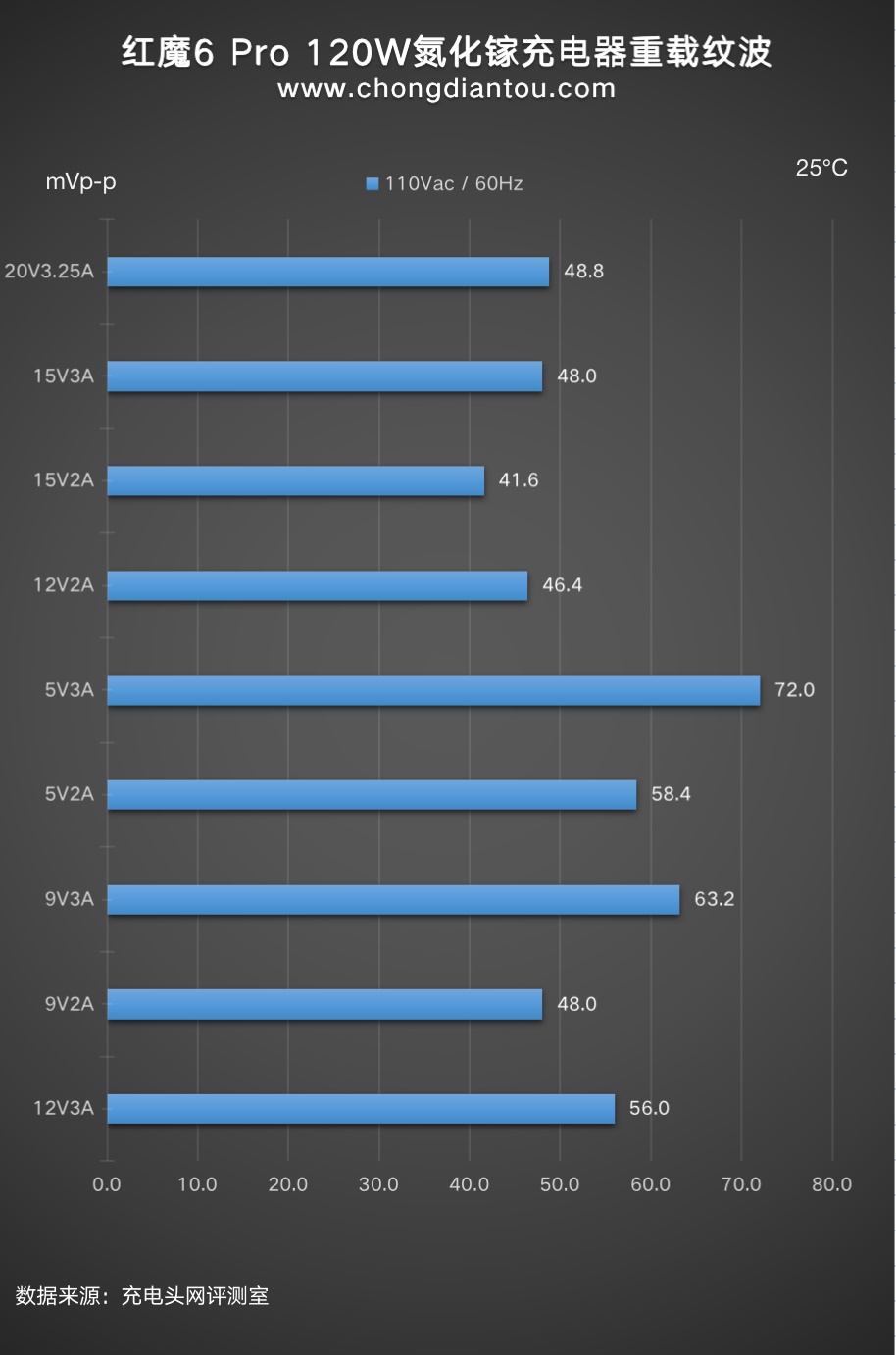 国家标准中充电器纹波要求是不高于200mVp-p,红魔6 Pro原装120W氮化镓充电器在110V 60Hz、240V 50Hz输入电压下,所有输出功率纹波峰峰值均低于200mVp-p这个标准,表现不错。