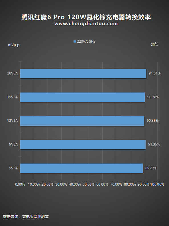 220V 50Hz下,将红魔6 Pro原装120W氮化镓充电器在各个电压档位的输出功率拉满进行测试:五个档位测得插线板AC端输入功率和USB端输出功率,通过计算,可得充电器的转换效率从89.27%到91.81%不等。