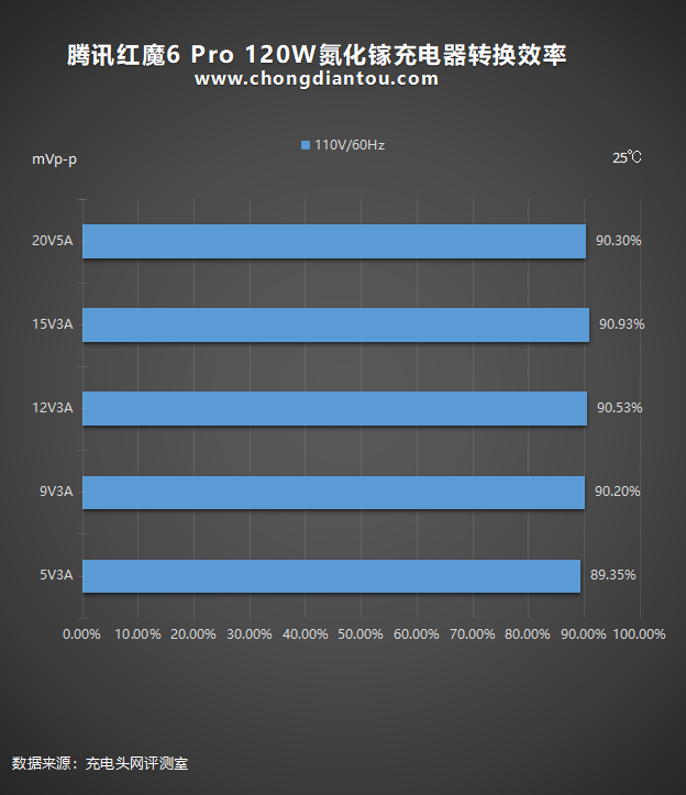 110V 60Hz下,充电器的转换效率从89.35%到90.93%不等。