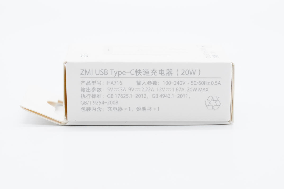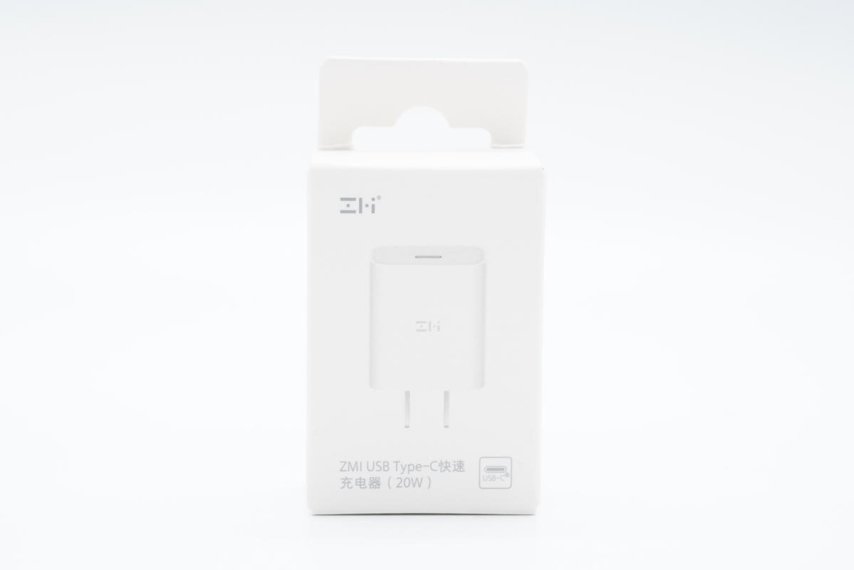 包装盒顶部带有挂钩设计,正面印有ZMI品牌、充电器外观图和名称、USB-C接口标识。