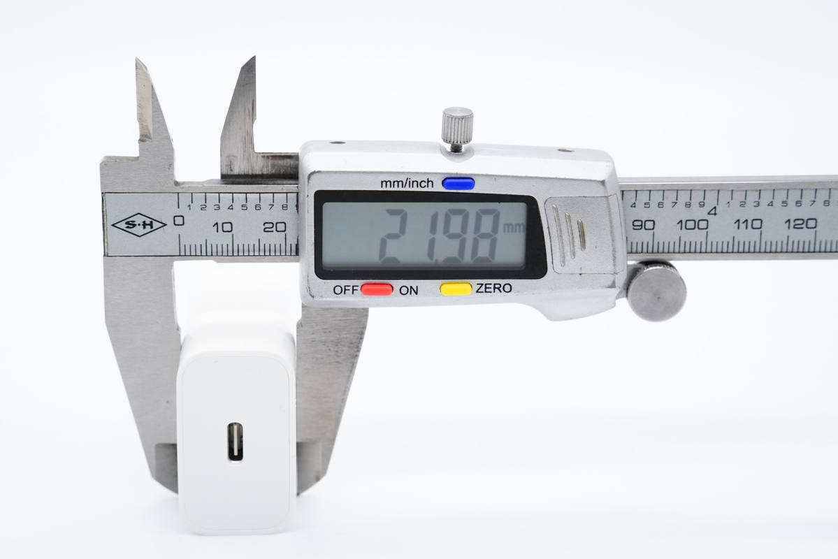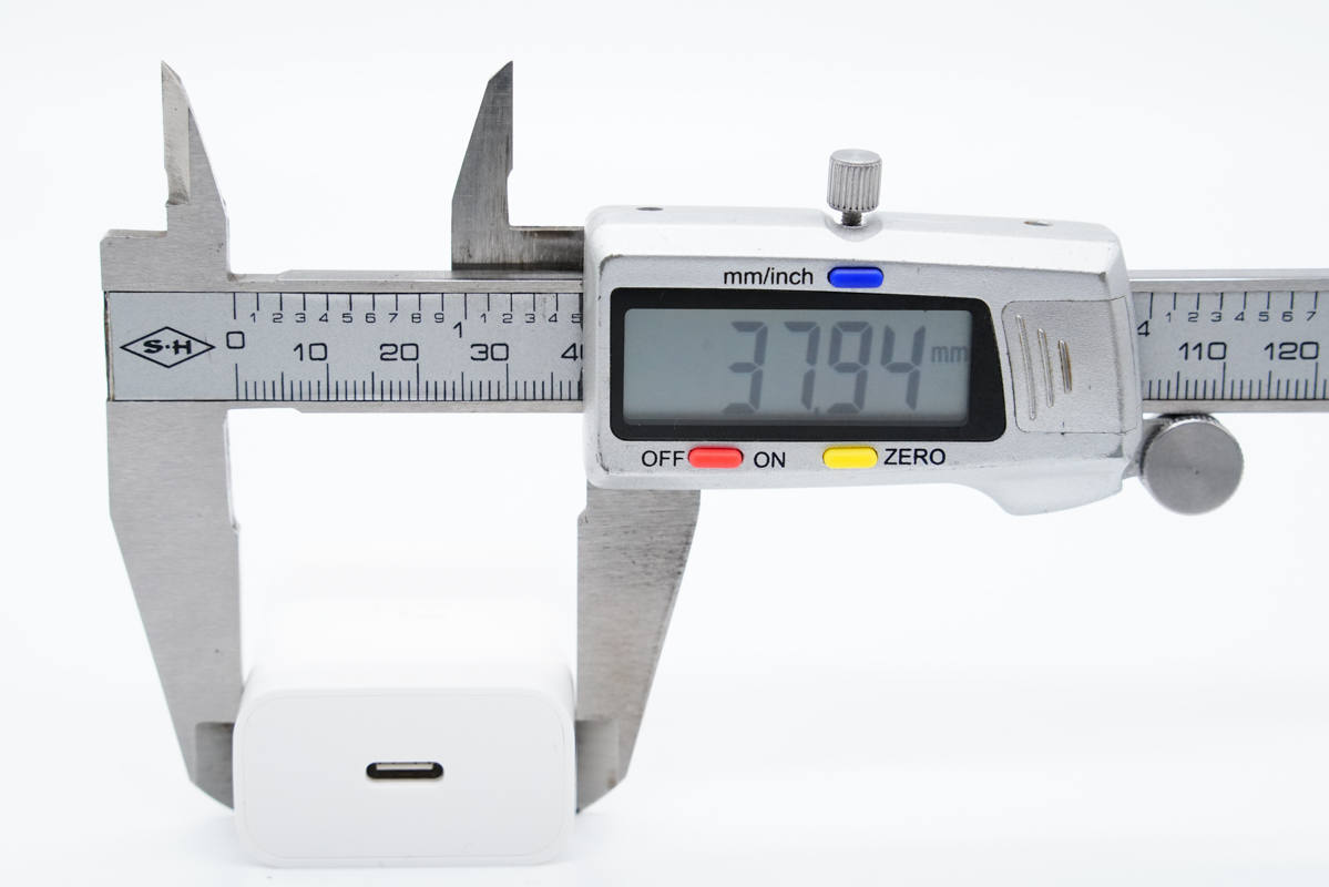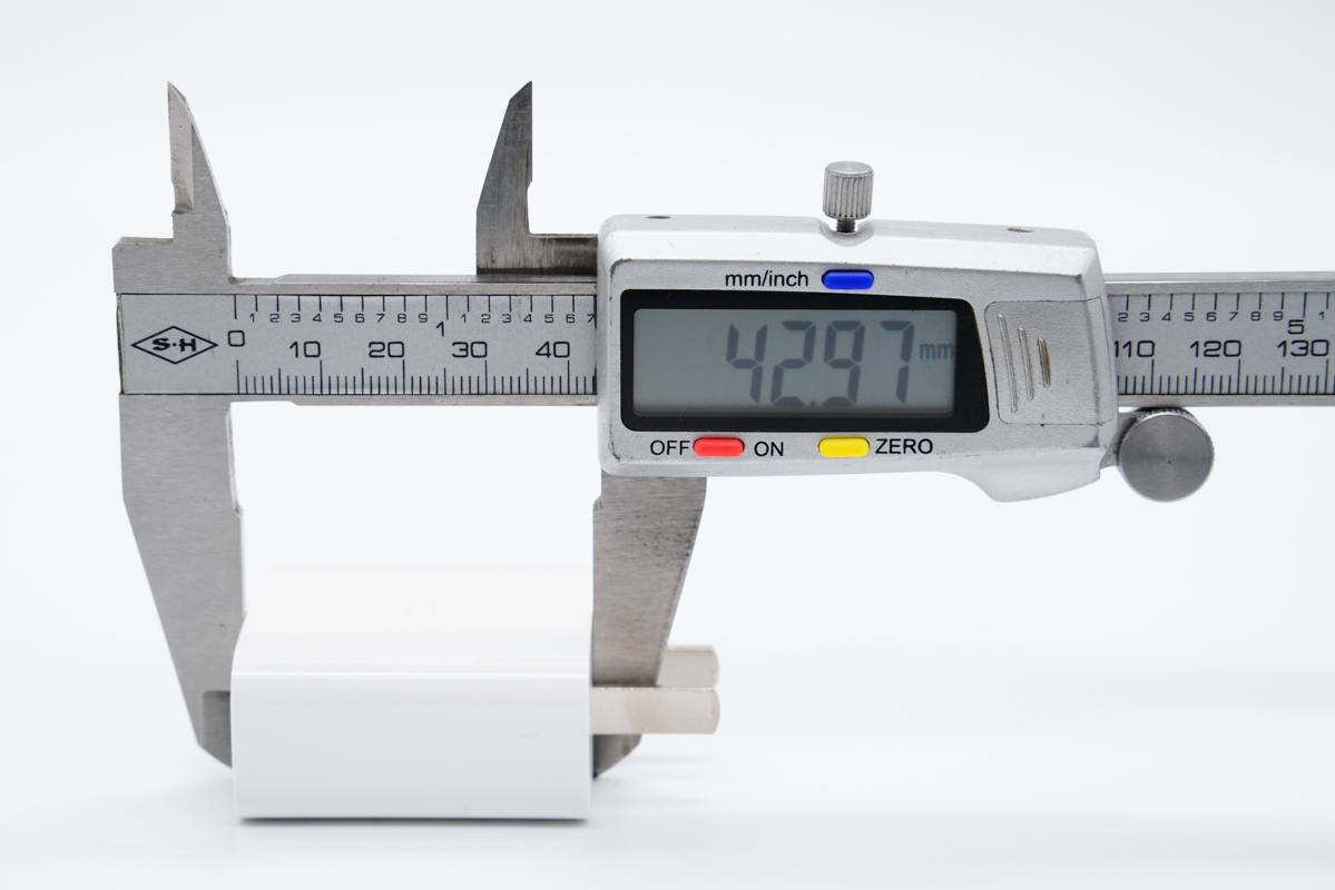使用游标卡尺实测充电器机身长度为42.97mm。