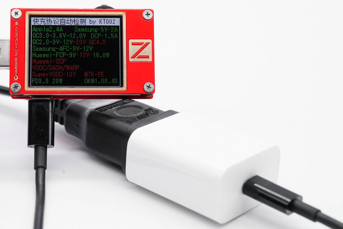使用ChargerLAB Power-Z KT002读取USB-C口的输出协议,显示支持Apple 2.4A、Samsung 5V2A、DCP协议,以及QC2.0/3.0、AFC、FCP、PD3.0多个快充协议。