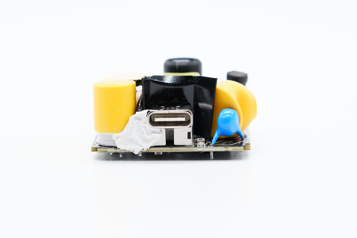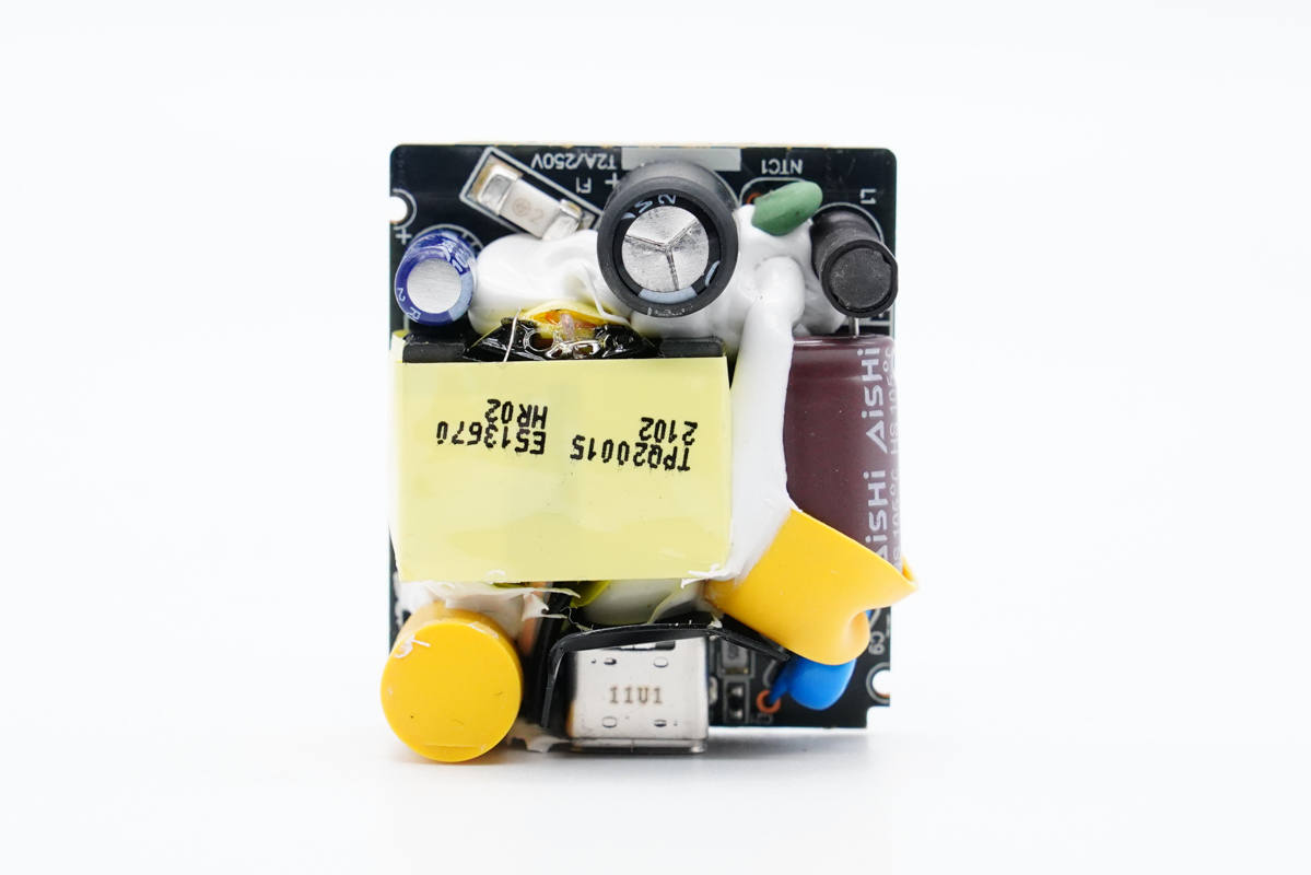 输出端一览,USB-C母座使用钢套加固,并且和变压器之间设有绝缘板进行隔离,两侧设有Y电容和输出滤波固态电容。