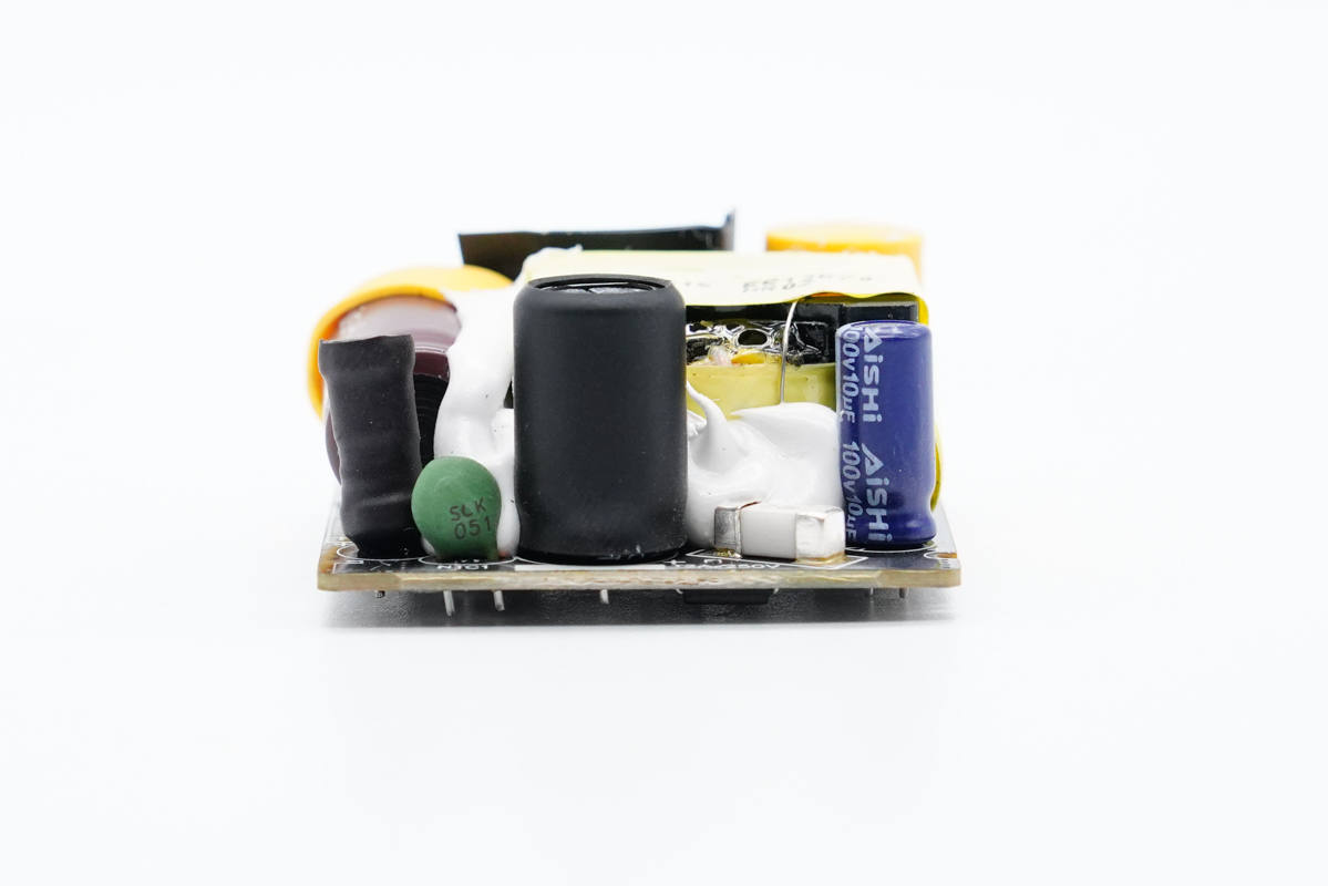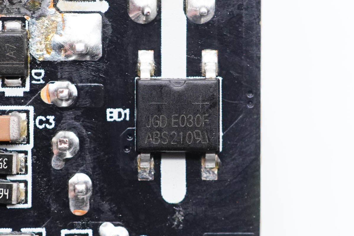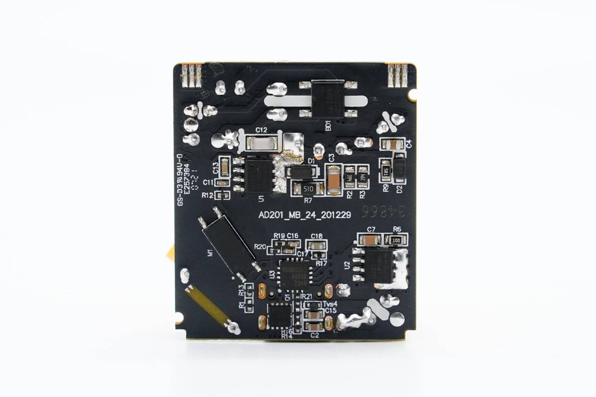 PCB板背面一览,初级侧设有整流桥和主控芯片,主控芯片集成开关MOS管;次级侧设有同步整流芯片、协议IC和VBUS开关。