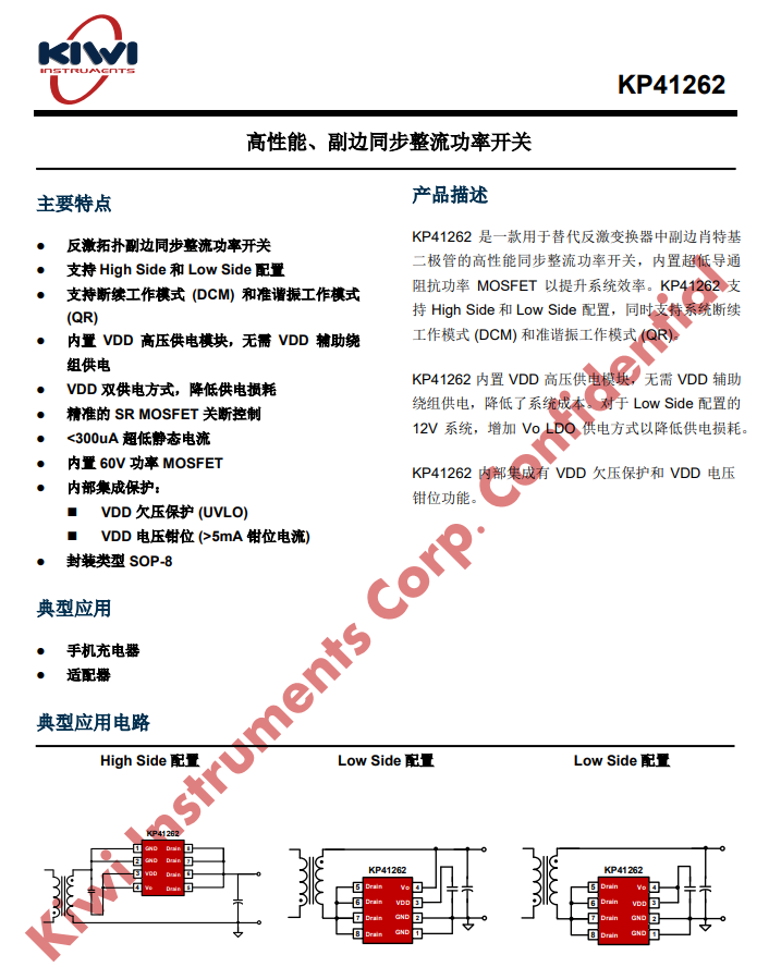 次级同步整流芯片同样采用必易微KP41262。这是一款用于替代反激变换器中副边肖特基极管的高性能同步整流功率开关,内置超低导通阻抗功率MOSFET以提升系统效率。支持High Side和Low Side配置,同时支持系统断续工作模式(DCM)和准谐振工作模式(QR)。