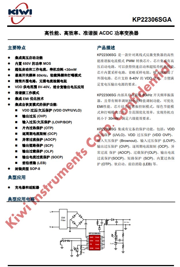KP22306SGA支持高压启动,专利轻载模式实现超低待机<30mW;准谐振控制、最高工作频率 80kHz;专利的EMC抖频设计,EMC Easy Pass;谷底锁定功能,轻载静音工作;输出过流点自适应调节;内置斜率补偿、过流点补偿等。