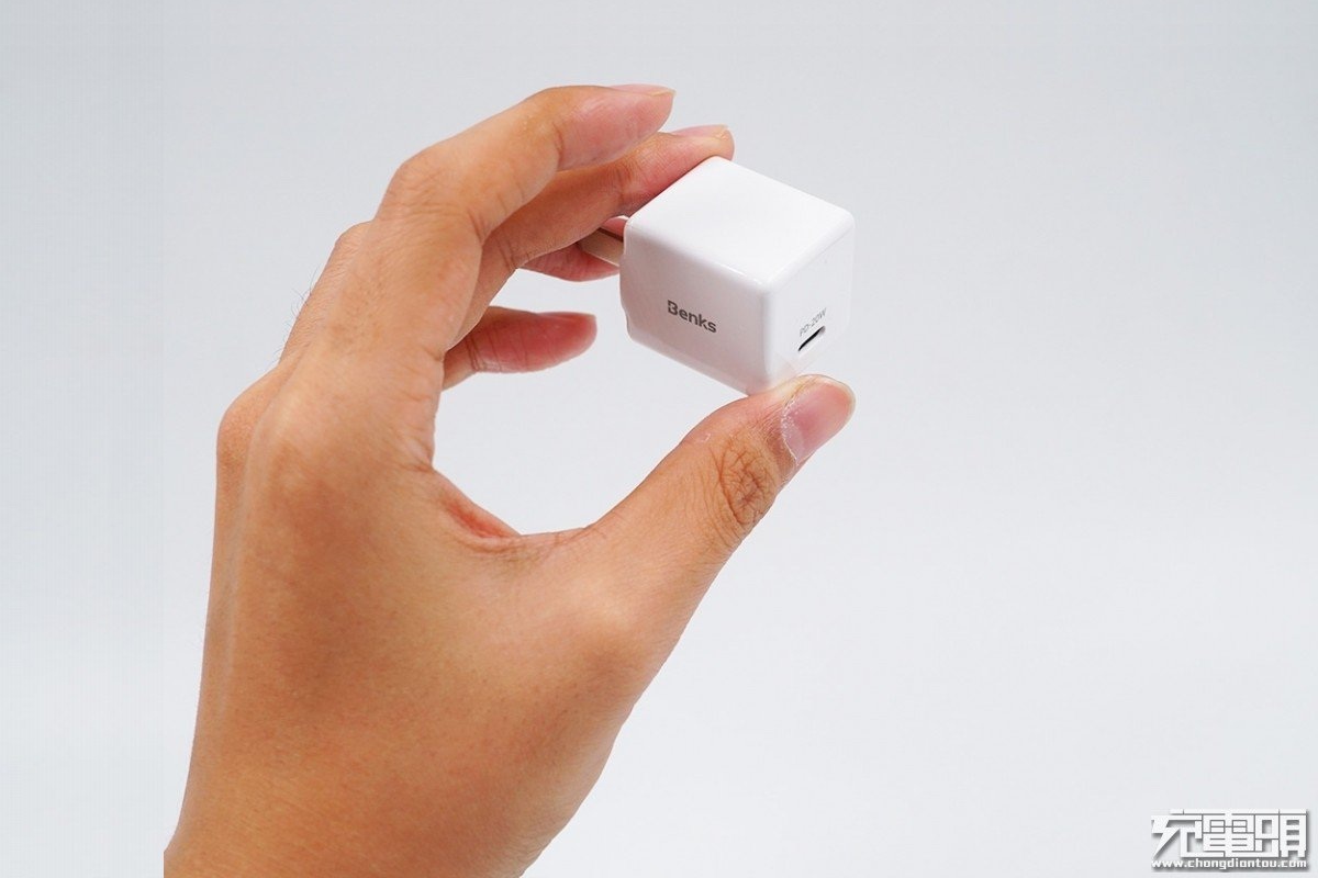 邦克仕Mini 20W PD充电器最大特色就是小巧玲珑,拿在手中感觉像是苹果祖传5W充电器,但输出功率高达20W。外观虽“有棱有角”但并不尖锐,就像iPhone 12的直角边框一样硬朗,PC材质壳体亮面工艺处理,侧面白底印有“Benks”的LOGO,非常简洁。