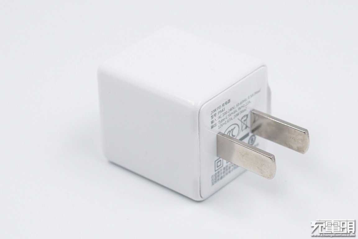 充电器插脚为固定两脚插脚,在机身壳两侧加入双翼支撑设计,确保充电器插入插座更稳固。使用游标卡尺实测充电器不含插脚三围分别是31.85mm X 27.63mm X 27.73mm,功率密度约为0.82W/cm³,净重约为32.7g。