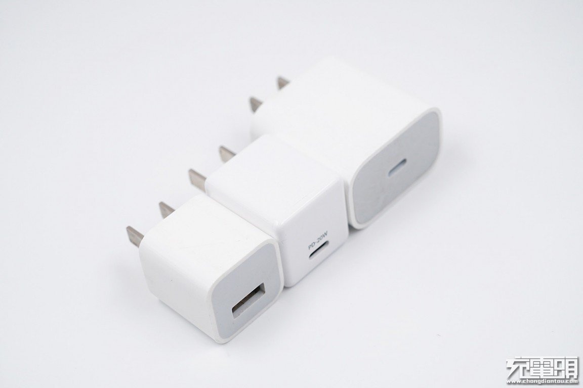 将苹果5W充电器、邦克仕Mini 20W PD充电器和苹果20W充电器排成一列,可以看到Benks充电器与苹果5W充电器相差不大,只有苹果20W一半那么大。同为固定插脚充电器,三者风格有些相似,Benks 20W以苹果5W的体积做到了苹果20W的性能,名副其实小钢炮。
