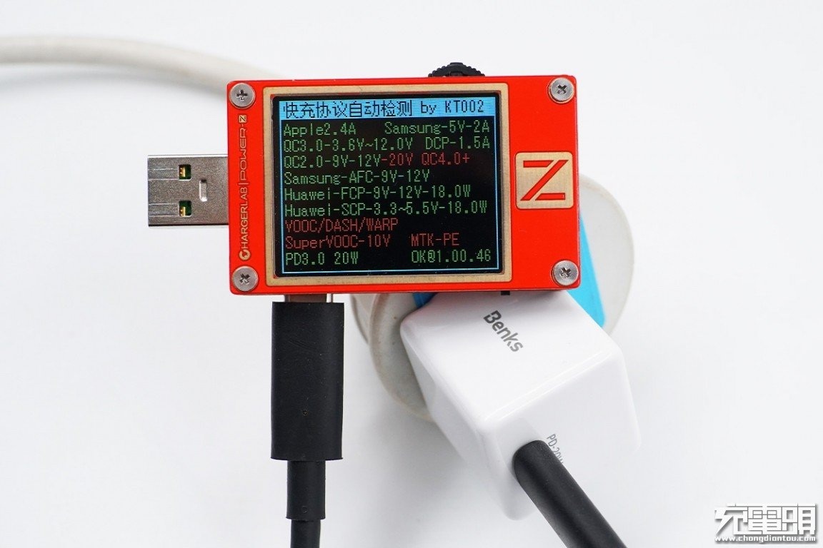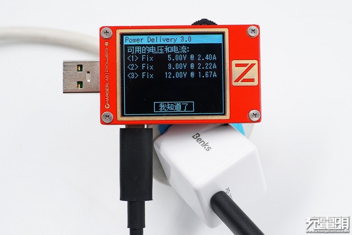 采用POWER-Z KT002 USB测试仪读取PDO报文,屏幕中显示USB-C口基于USB PD3.0快速充电标准开发,带有5V⎓2.4A、9V⎓2.22A和12V⎓1.67A三组固定电压档位。