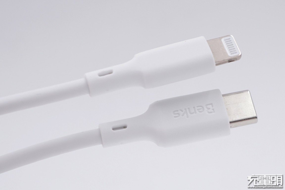 套装中另一个配件是邦克仕M13 USB-C to Lightning数据线,采用柔韧的TPE材质线身制作,数据线端子头一体注塑成型工艺,表面凹印了”Benks”字样的Logo,磨砂哑光工艺改善手感。
