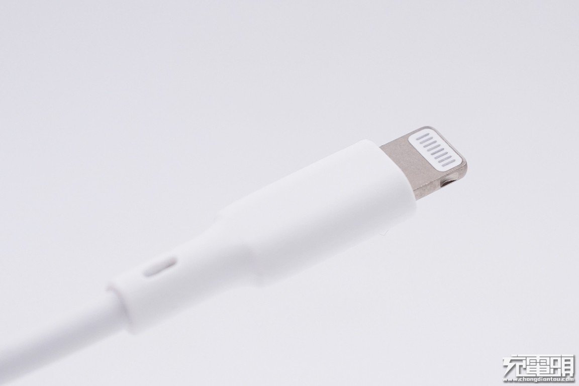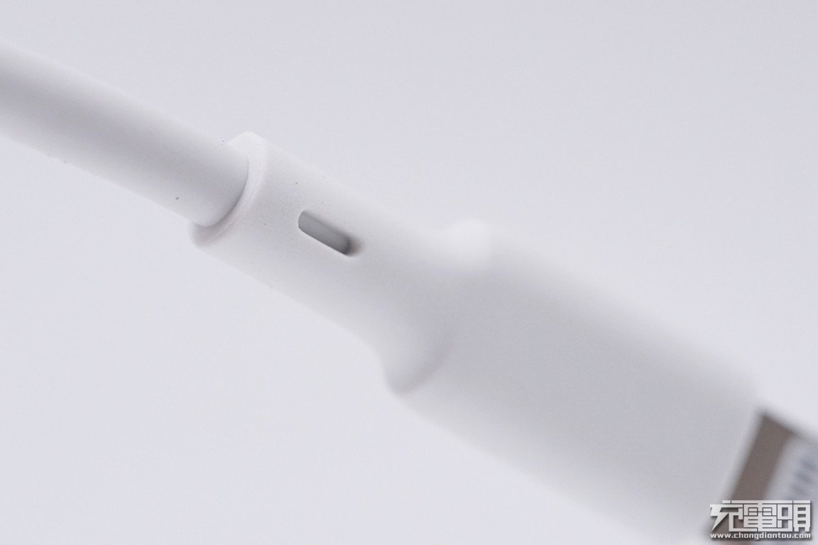 邦克仕M13 USB-C to Lightning数据线的端头与网尾一体化成型,网尾呈流线形,加固加长。网尾上开了一个小孔,保证其有一定的弯曲能力,官方也声称通过10000次暴力弯折测试。