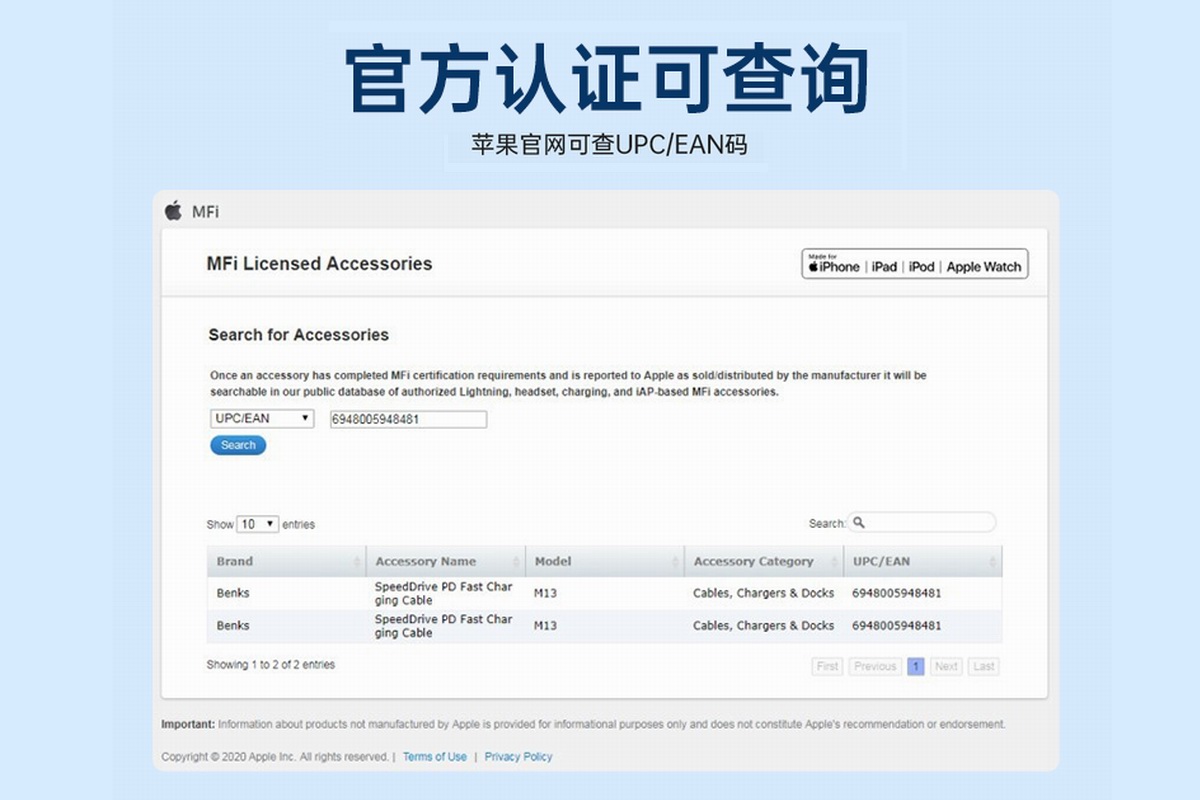 iPhone采用了Lightning私有接口,苹果在专用的数据线中使用MFi认证芯片作周全保护的同时也完成私有生态建设,2019年苹果开放MFi线缆认证给第三方品牌使用,邦克仕M13 USB-C to Lightning数据线采用苹果C94原厂端子,并取得了苹果官方MFi认证,线缆专属的UPC/EAN码:6948005948481,在苹果官方可查询。