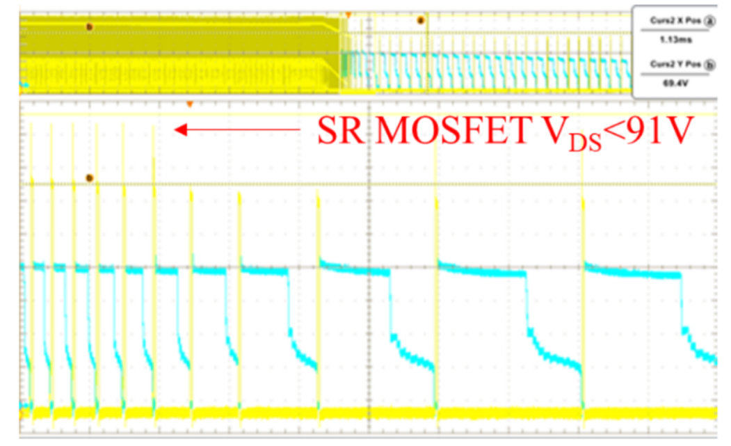专利技术,配合业界超短关断延时SR,同步整流管采用100V MOSFET足以应对各种故障状态。265V ac输入,输出短路条件下,SR MOSFET VDS电压最高仅91V。