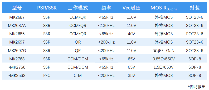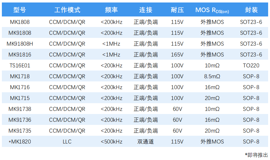业界超快(关断延时10ns)的115V CCM 同步整流控制器MK1808;4A Source/Sink驱动电流的120V高侧及低侧驱动器产品MD18211;110V耐压、待机小于100μA的同步降压(Buck)转换器芯片MK901X;以及110V电压等级AC-DC PWM芯片MK2687。