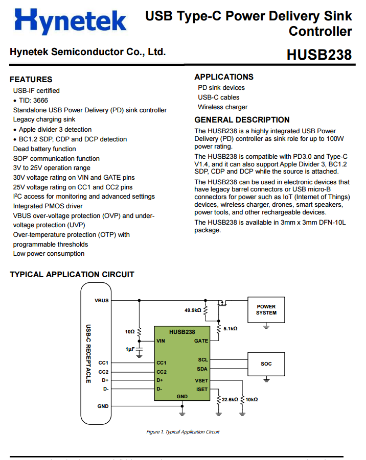 HUSB238支持3mmx3mm DFN-10L封装和3.9mmx4mm SOT33-6L封装, 可以用于将传统桶连接器或USB micro-B电源连接器的电子设备替换为USB Type-C口进行快速充电,如Type-C to DC转接线、无线充电器、无人机、物联网设备、智能扬声器、电动工具、智能家居、小家电、电子烟和其他便携式设备。