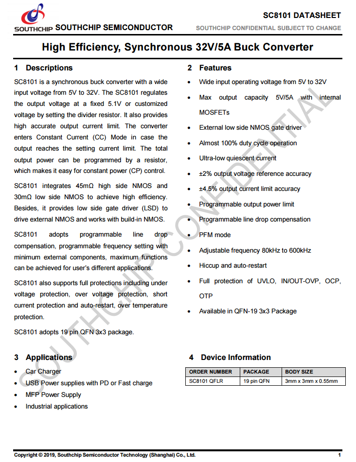 SC8101还提供高精度的输出电流限制,当输出达到设定电流极限时,变频器进入恒流(CC)模式;总输出功率可由一个电阻编程,便于恒功率控制,内置开关管可提供5V5A输出。