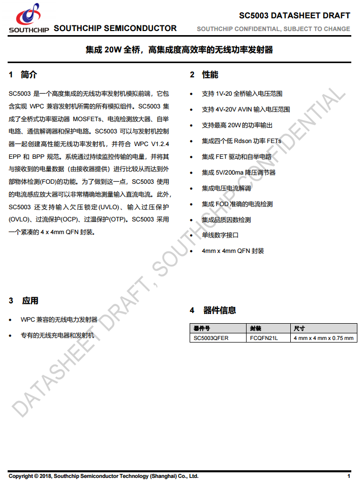 手机无线充集成功率级芯片采用南芯SC5003。这是一个高度集成的无线功率发射器模拟前端,它包含实现WPC兼容无线充电器所需的所有模拟组件,集成了全桥式功率驱动器MOSFETs、电流检测放大器、自举电路、通信解调器和保护电路。