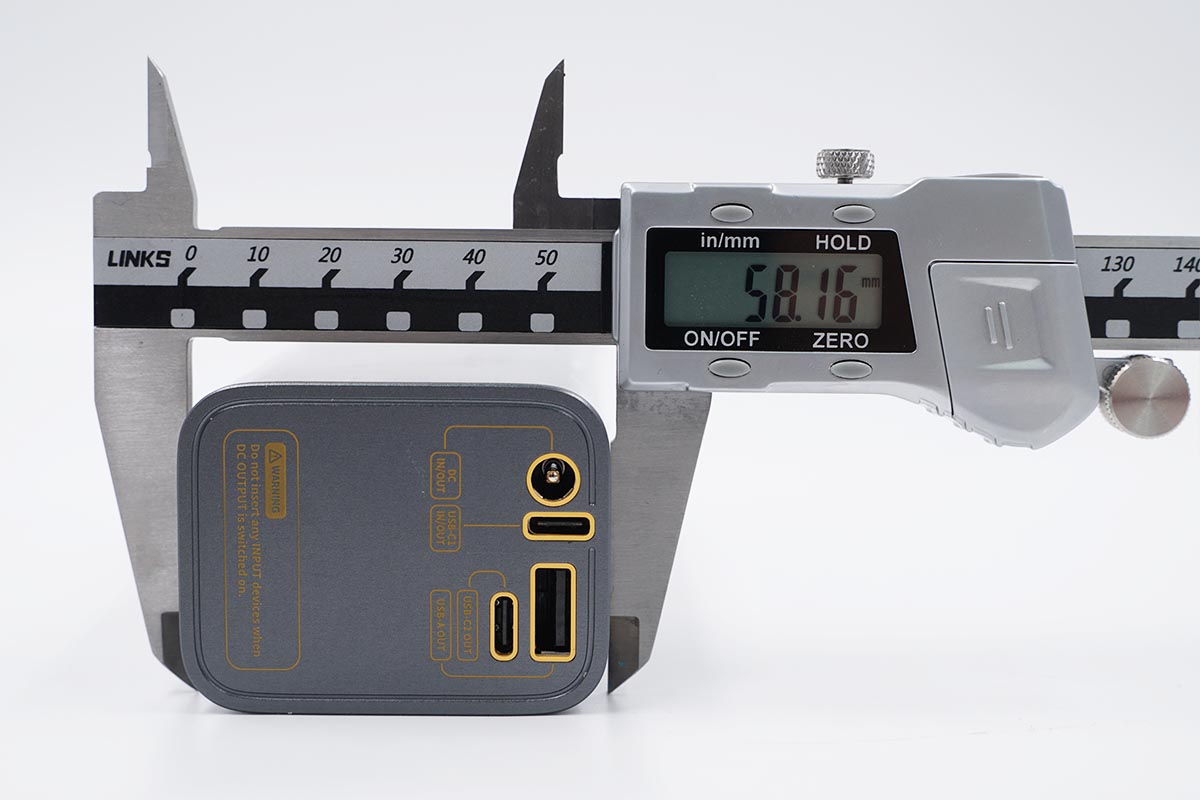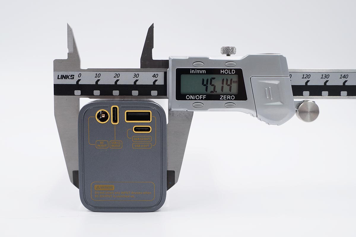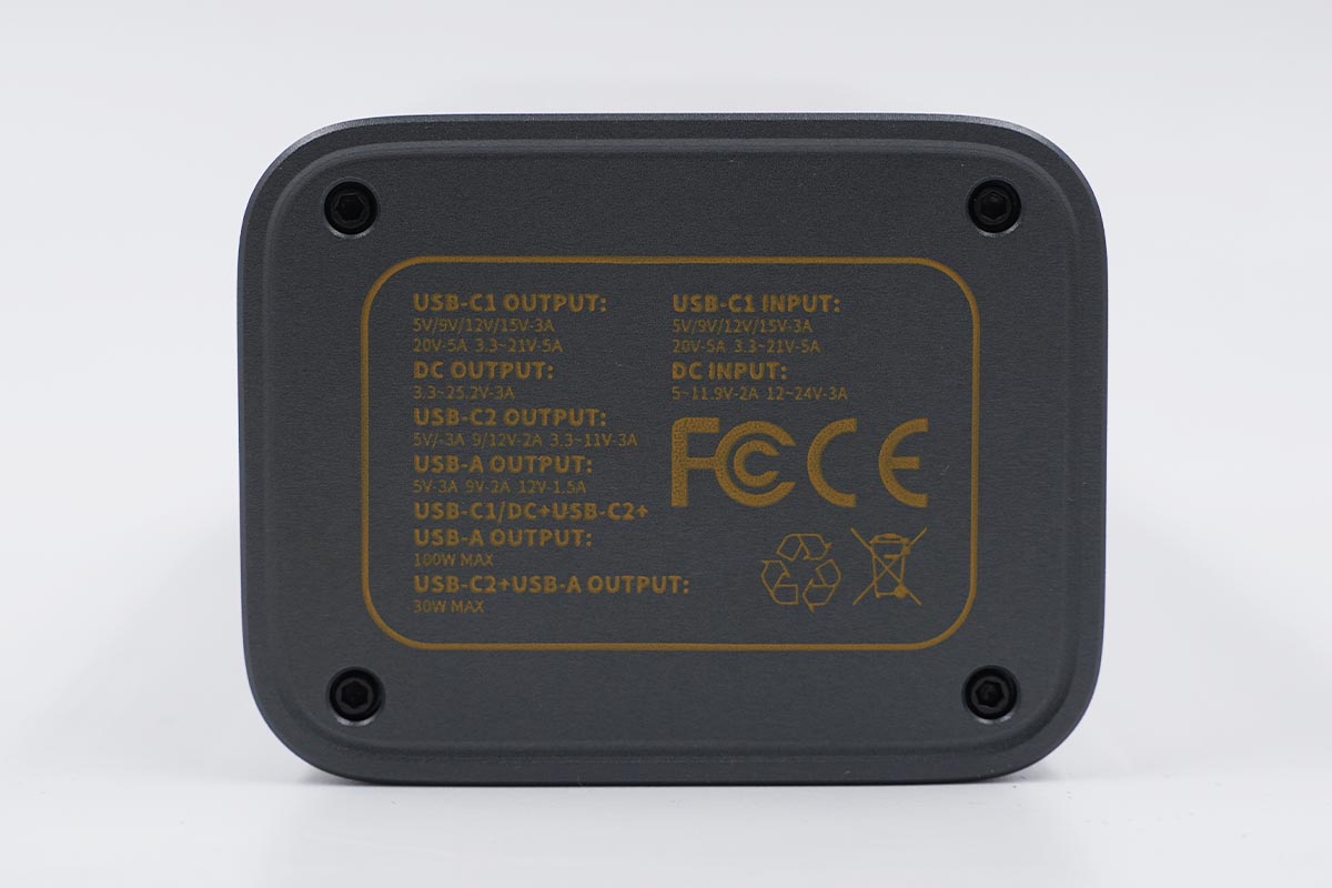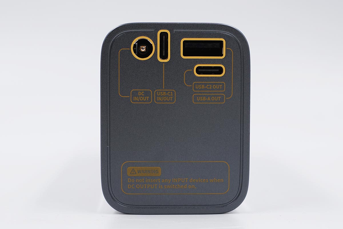 充电宝的接口则全部集中在侧面,并使用黄色线圈勾勒出来,看上去非常的清晰明了。充电宝共配备了4个接口,分别是DC输入/输出接口、USB-C1输入/输出接口、USB-A输出接口以及USB-C2输出接口。