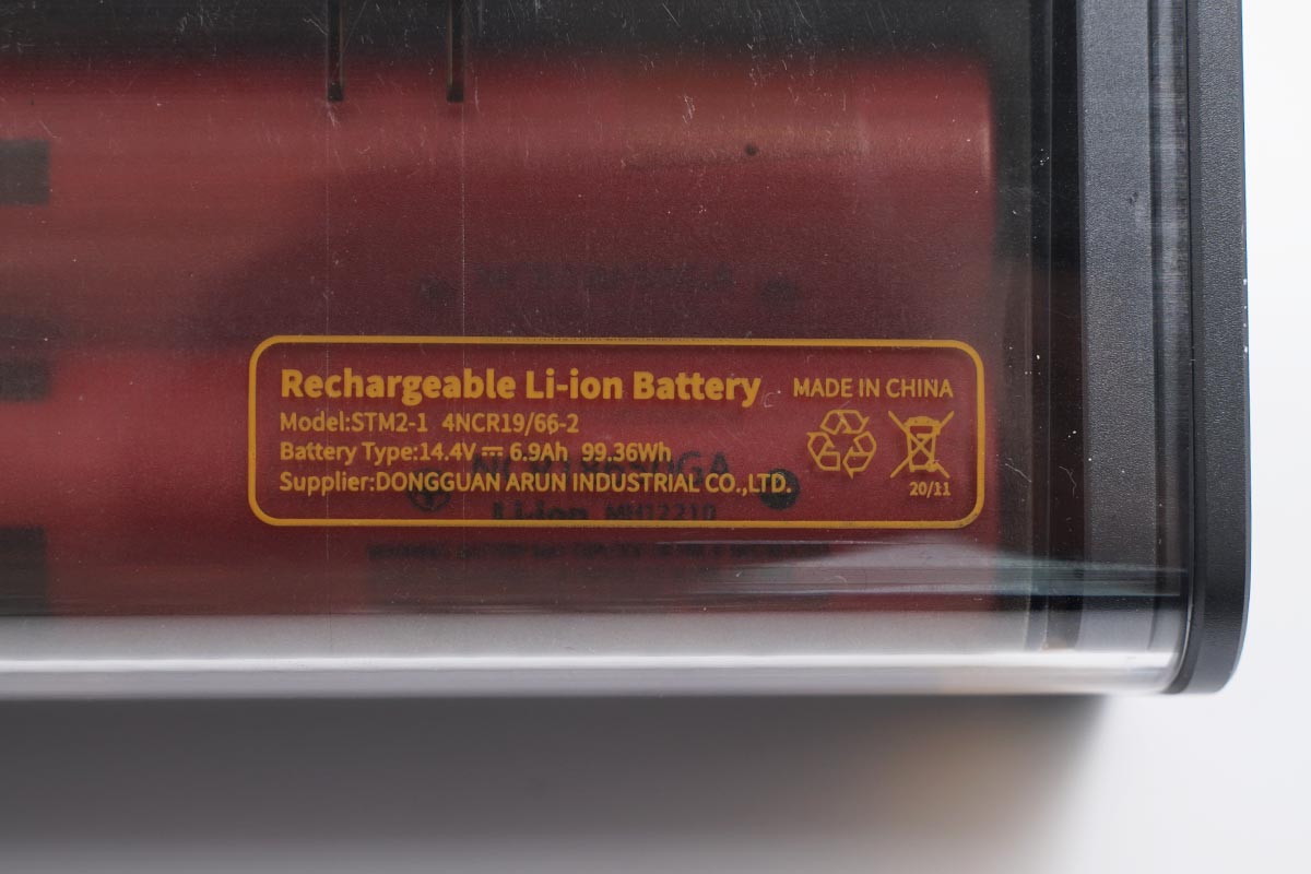 壳体的角落印制着产品的一些参数,充电宝的型号为STM2-1,电池能量为14.4V 6.9Ah 99.36Wh。中国制造。