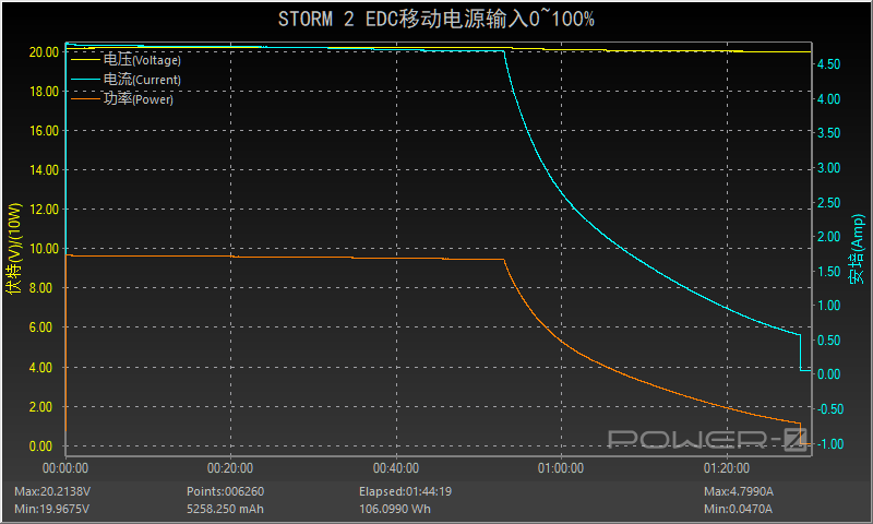 使用100W PD充电器为充电宝充电,连接充电器之后握手20V5A快充输入档位,53分前功率在96W左右,随后功率和电流逐渐下降直至充电结束,全程耗时约1小时28分,最高功率为20.19V 4.76A 96.16W 。