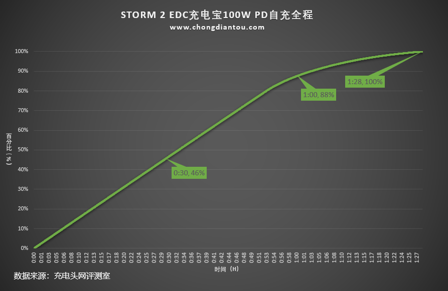 将自充全程绘制成曲线图,可以看出使用100W PD充电器为充电宝半小时可以充电46%,1小时充电88%,完全充满需要1小时28分。