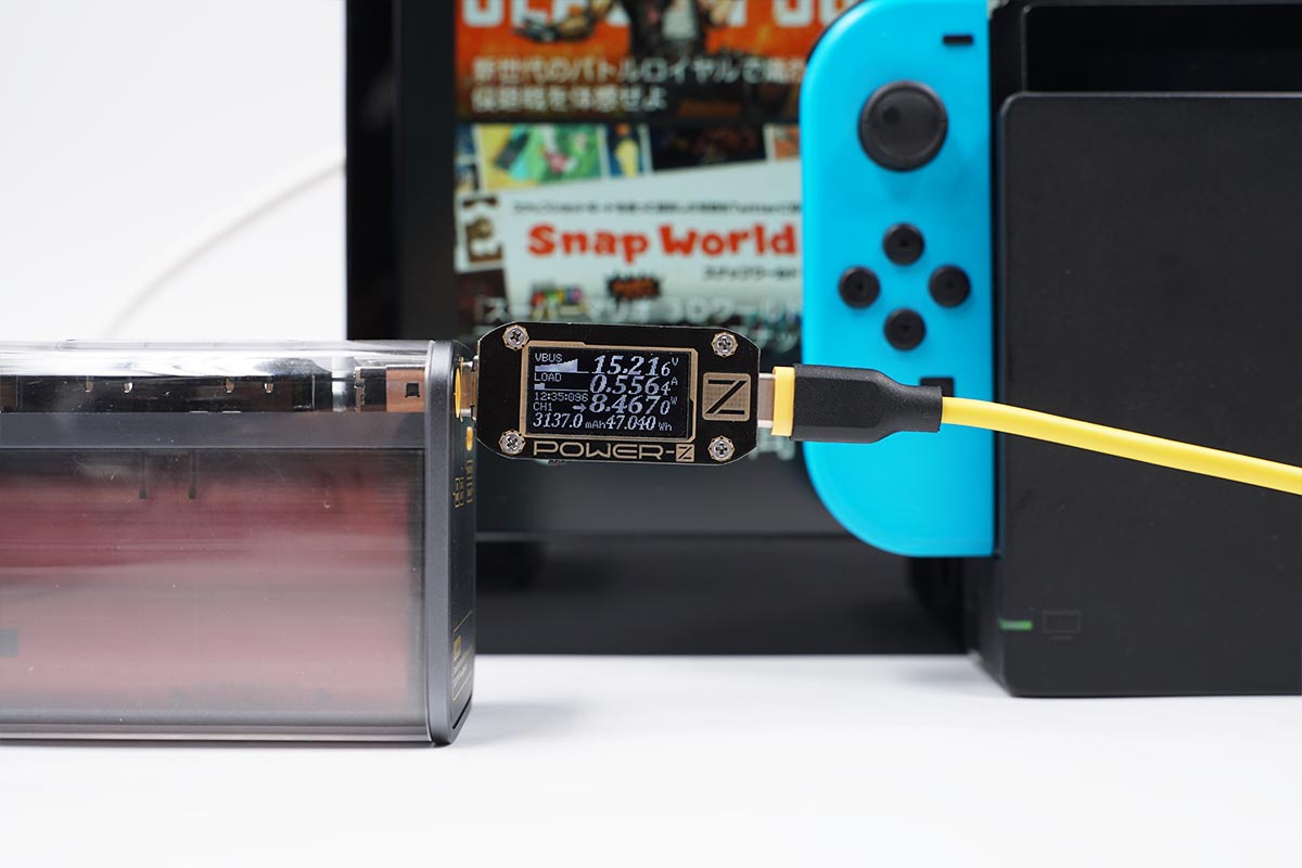 Switch带有特殊的底座TV模式,需要15V3A PDO才可以正常工作,非常挑充电设备。使用USB-C1为Switch底座供电,功率为15.21V 0.55A 8.46W,成功握手底座TV模式,底座正常对显示屏输出HDMI信号。