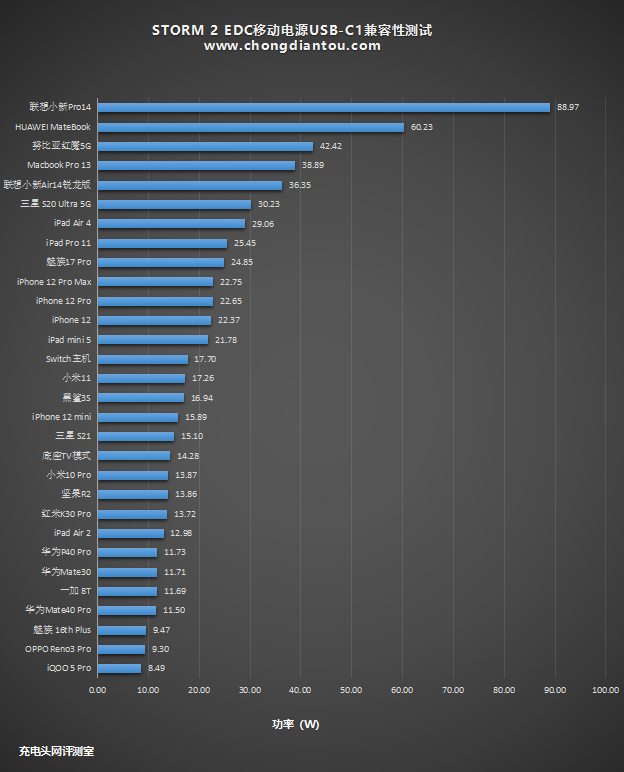 从整个柱状图来看联想小新Pro14的快充功率最高,达到了88.97W,剩下的几款笔电功率在36W-61W左右。触发PD快充的安卓手机功率在11W-43W左右,苹果设备的快充功率在12W-30W左右。