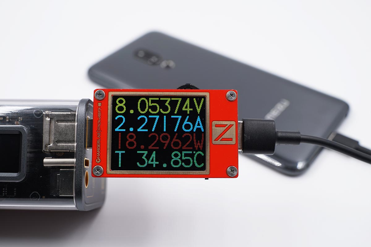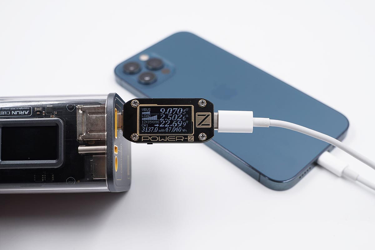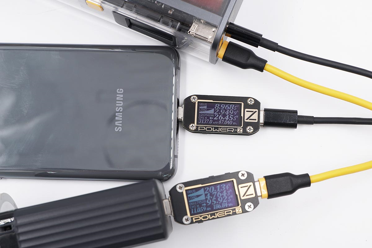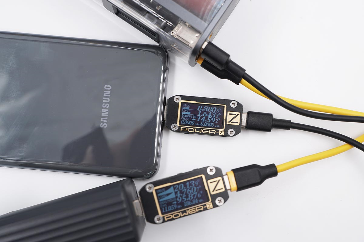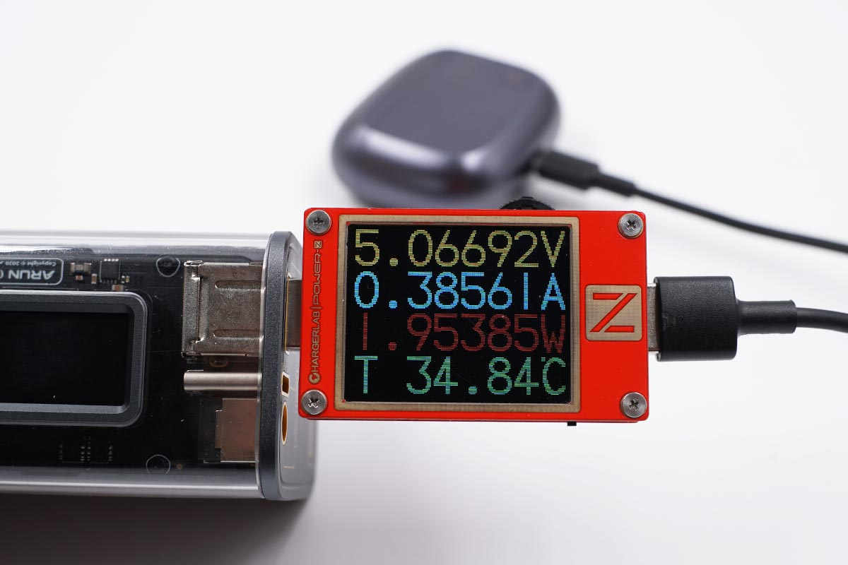 通过USB-C为充电宝充电,同时使用USB-C2为手机充电,实测充电宝支持USB-C1输入的同时USB-C2输出且均处于快充状态。