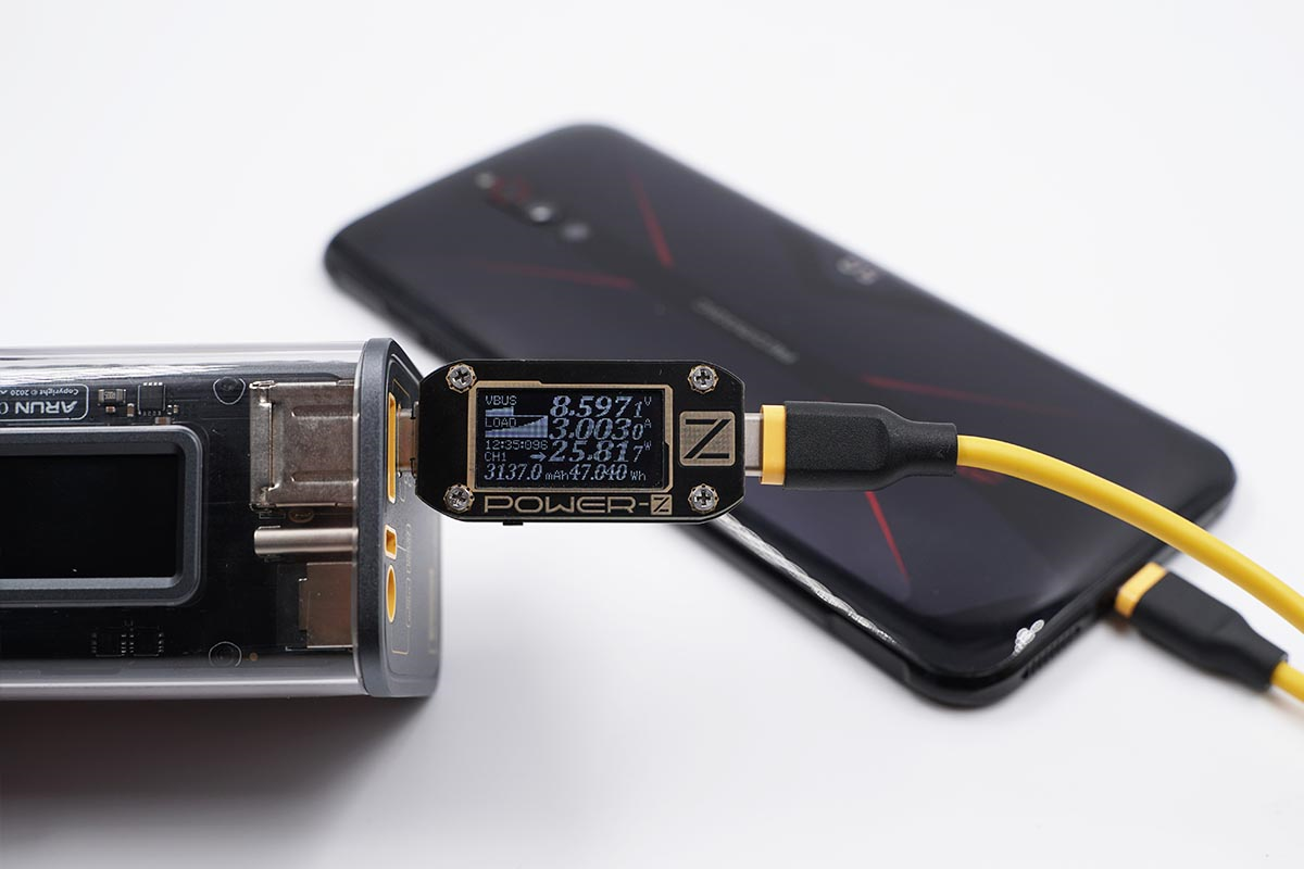 努比亚红魔5支持PPS/PD/QC快充协议,使用USB-C2为努比亚红魔5充电,功率为8.57V 3A 25.81W。