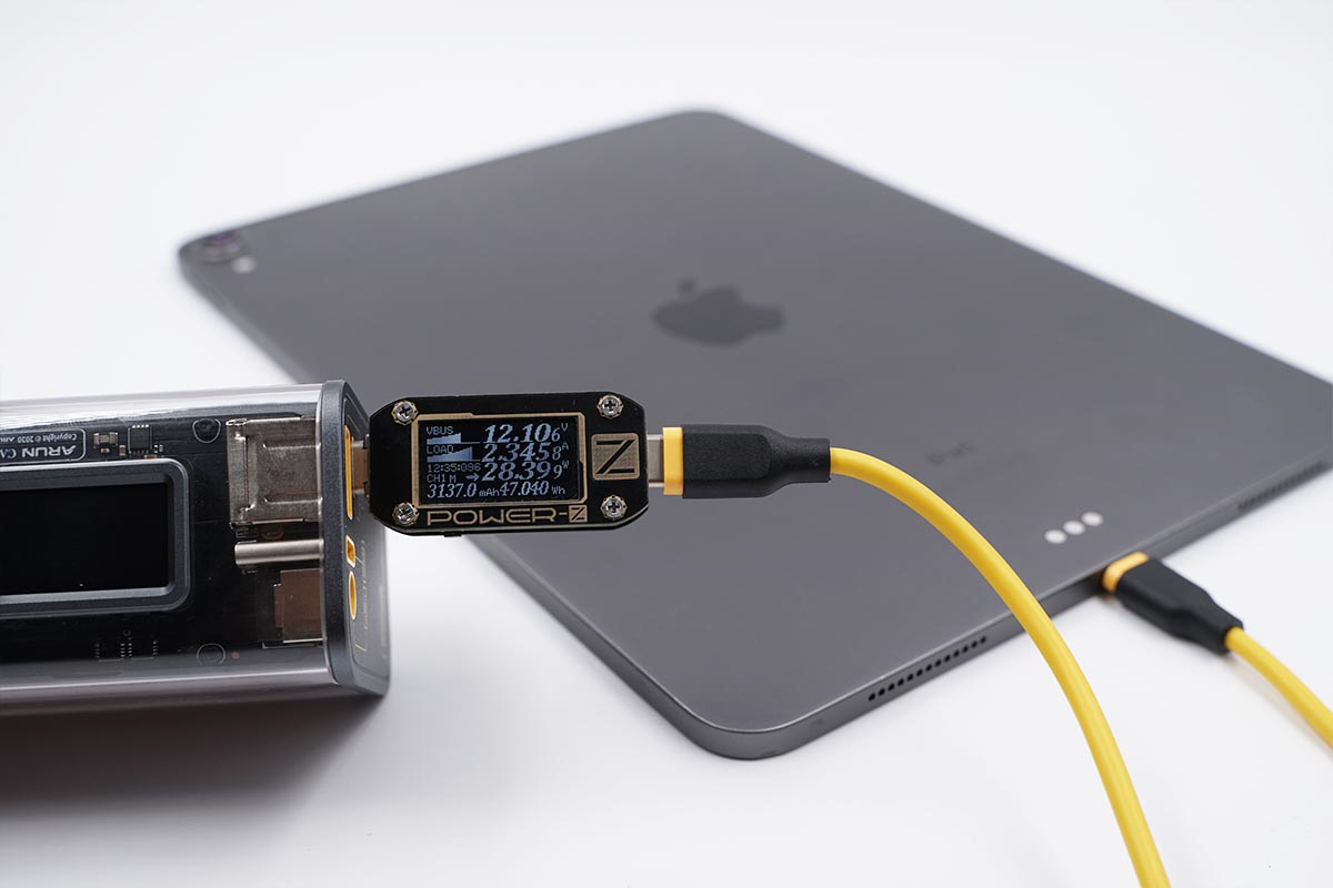 iPad Pro仅支持PD快充,使用USB-C2为iPad Pro充电,功率为12.10V 2.34A 28.39W,成功握手PD快充。