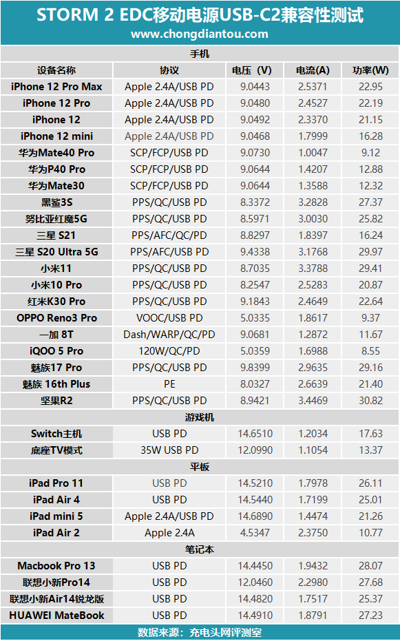 将USB-C1的测试数据汇总成表,整体上看为大部分设备充电均可以触发PD快充,部分支持PPS大功率充电的手机也可以有30W-50W这样的快充,只是在为小米10 Pro和红米K30 Pro充电时功率在13W左右,为魅族16th Plus充电功率为9.47W。