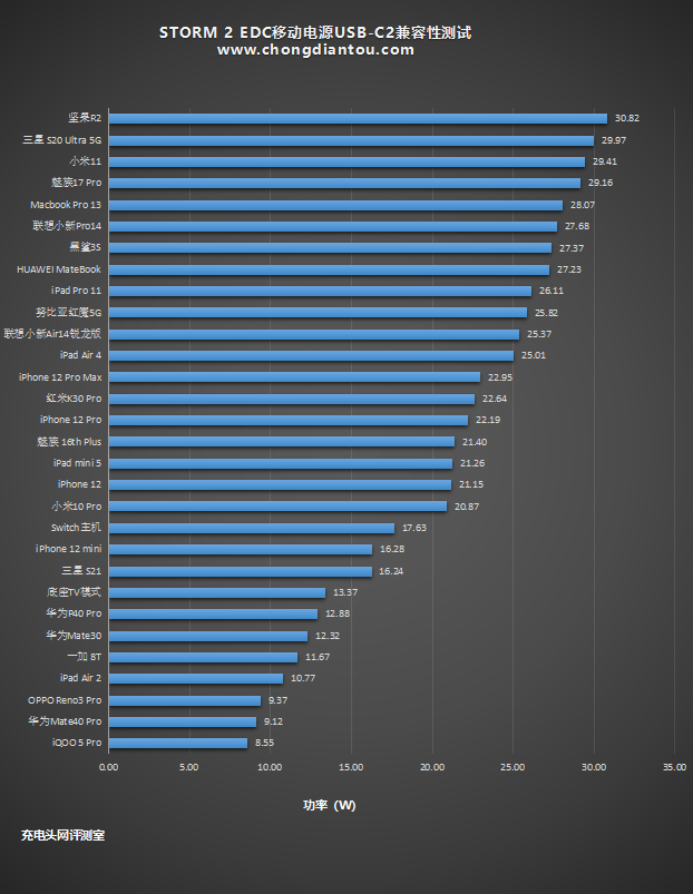 相较于USB-C1来讲,USB-C2的快充柱状图走向较为平缓,坚果R2的快充功率最高,达到了30.82W,部分笔电和平板等大功率需求的设备功率在25W以上,一些不支持PD快充的手机功率较低,在10W左右。