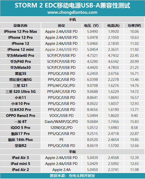 最后将USB-A的测试数据汇总成表,为苹果设备可以提供Apple2.4A充电,为华为手机充电可以握手SCP快充,对于其他安卓机型则可以提供QC快充。
