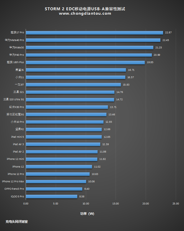 从整个柱状图来看,魅族17 Pro的充电功率最高达到了22.87W,华为手机的充电功率在20W以上,苹果设备的充电功率在12W左右,触发QC快充的安卓手机功率在12W-23W之间,而对于魅族魅族16th Plus也可以提供近20W的PE快充,表现不错。