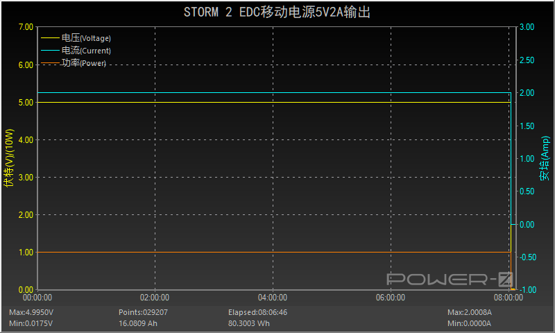 对充电宝的输出效率进行测试,首先以5V2A 10W输出功率进行测试,整个测试过程中三大数据平台均持稳定的输出状态,全程耗时约8小时03分。放出的能量为80.3003Wh,所以充电宝在以5V2A档位输出时效率为80.3003/99.36=80.81% 。
