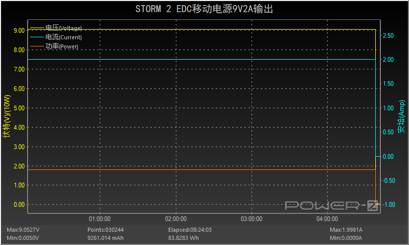 将功率升级至9V2A 18W,整个测试过程数据表现和5V2A相同,输出非常稳定,全程耗时约4小时38分。放出的能量为83.8283Wh,所以充电宝在以9V2A 18W输出时效率为83.8283/99.36=84.36% 。
