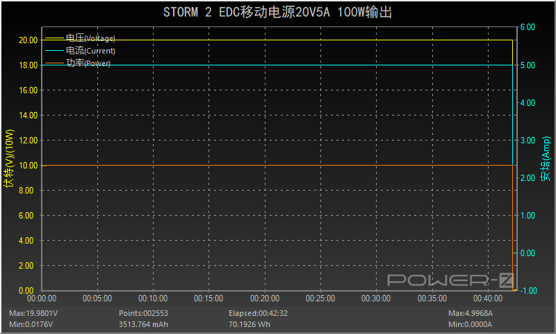 最后以20V5A 100W的功率对充电宝进行测试,和前两次测试结果相同,输出全程非常稳定,全程耗时约42分。非常的能量为70.1926Wh,所以充电宝在以20V5A 100W功率输出时效率为70.1926/99.36=70.64% 。