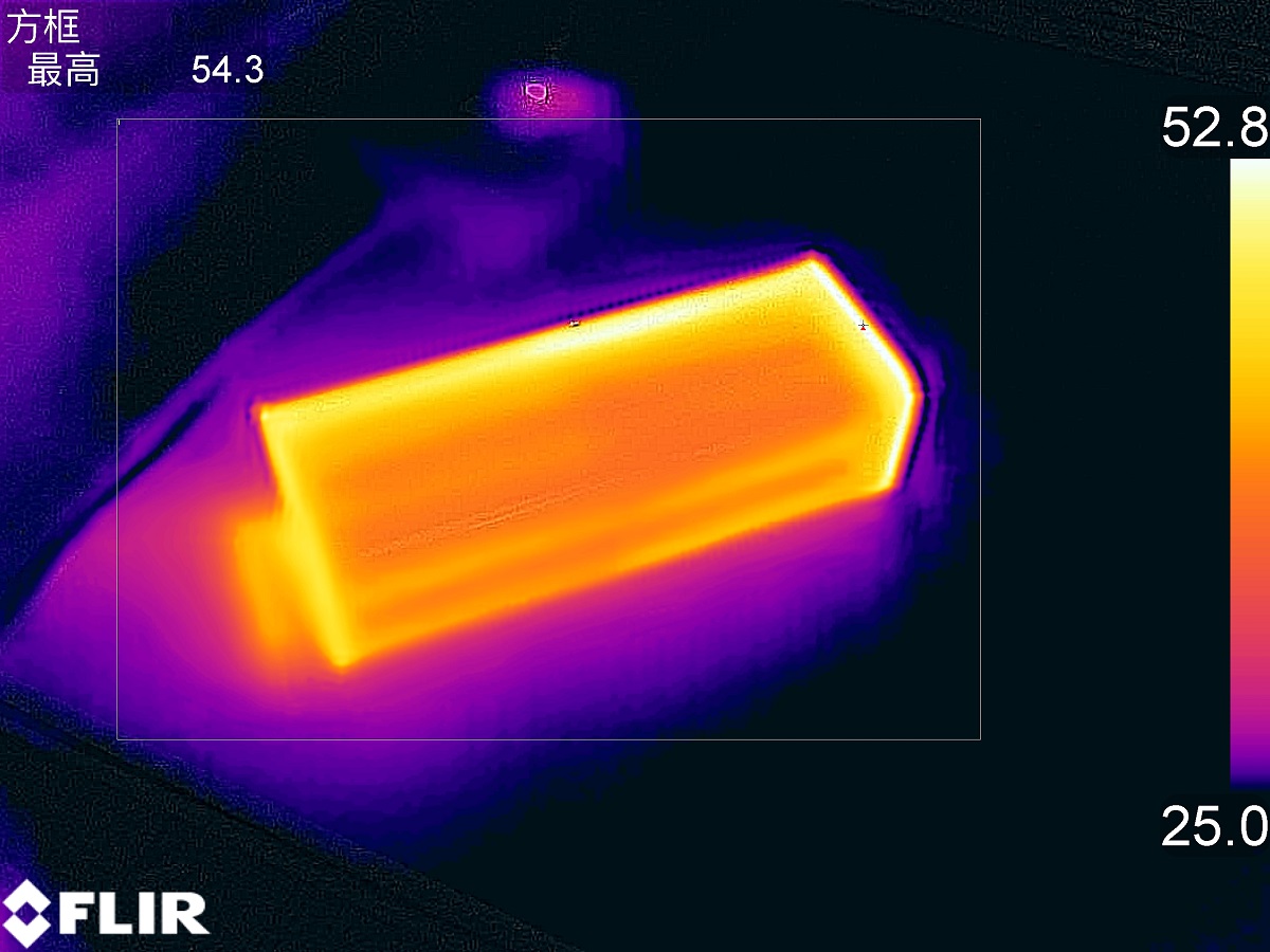 下面来看一下充电宝的温控表现如何,测试条件为在温度约为25℃的恒温箱中以20V5A 100W的功率持续输出半小时的温升情况进行测试。