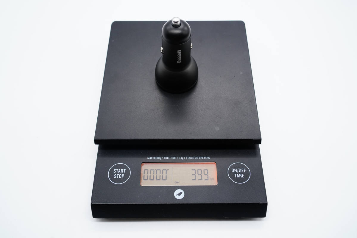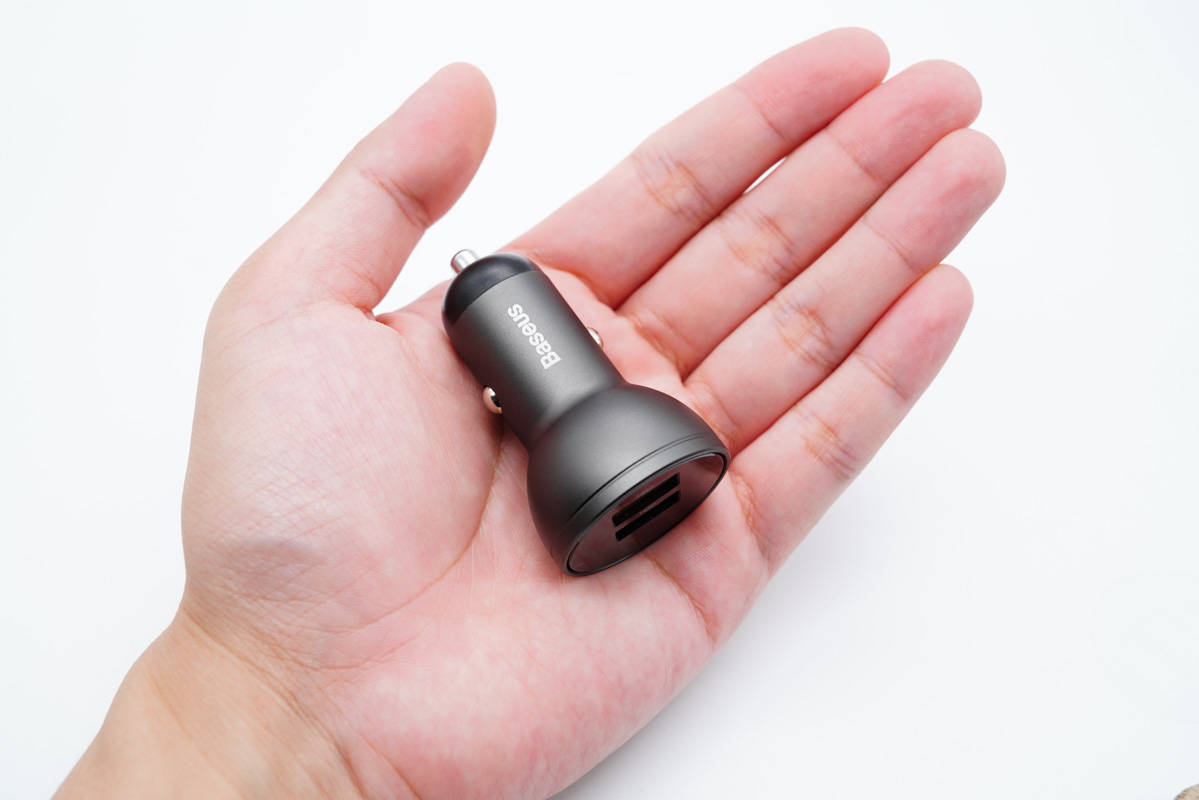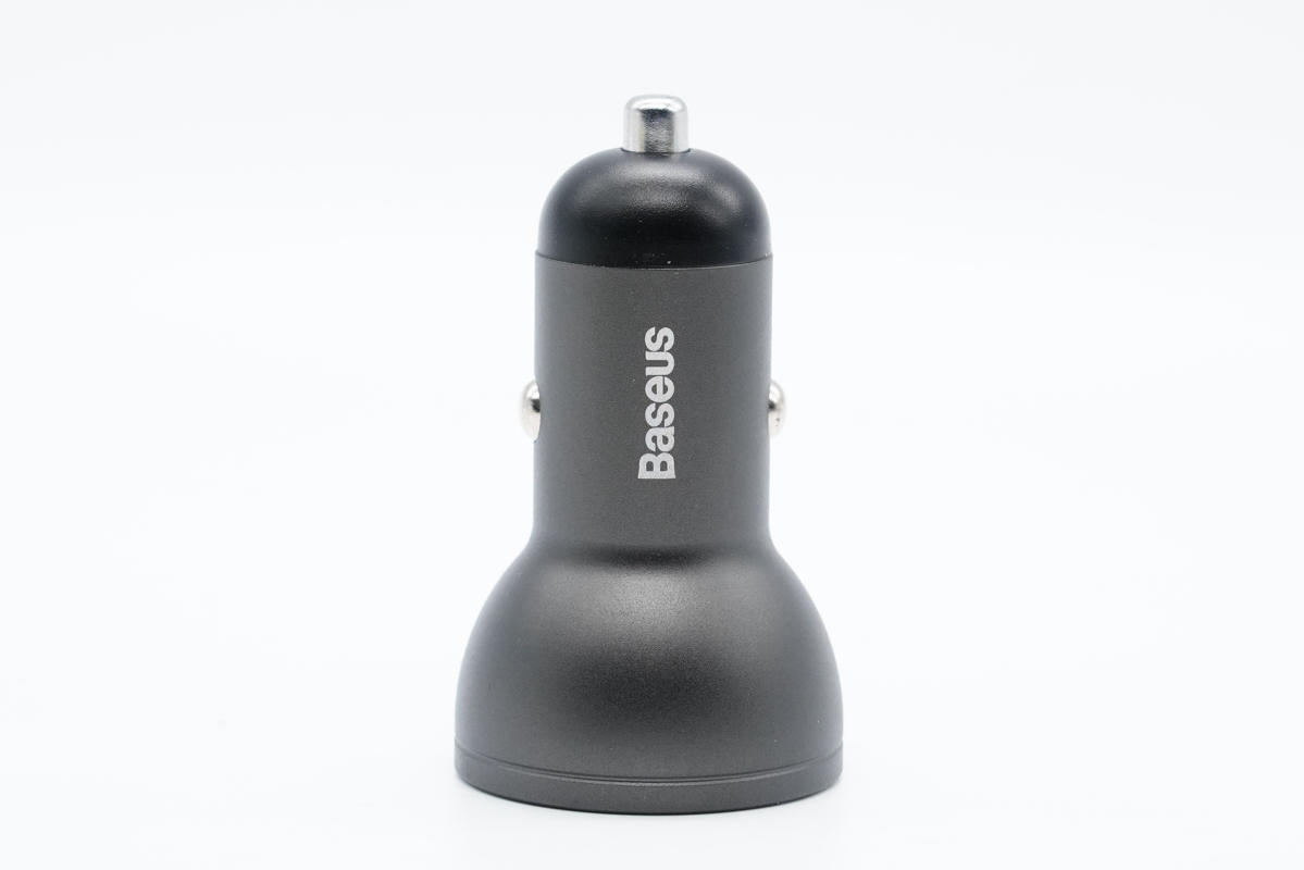 车充采用塑料加铝合金外壳,金属壳哑光灰色,机身流线型设计整体圆润,正面印有Baseus品牌。