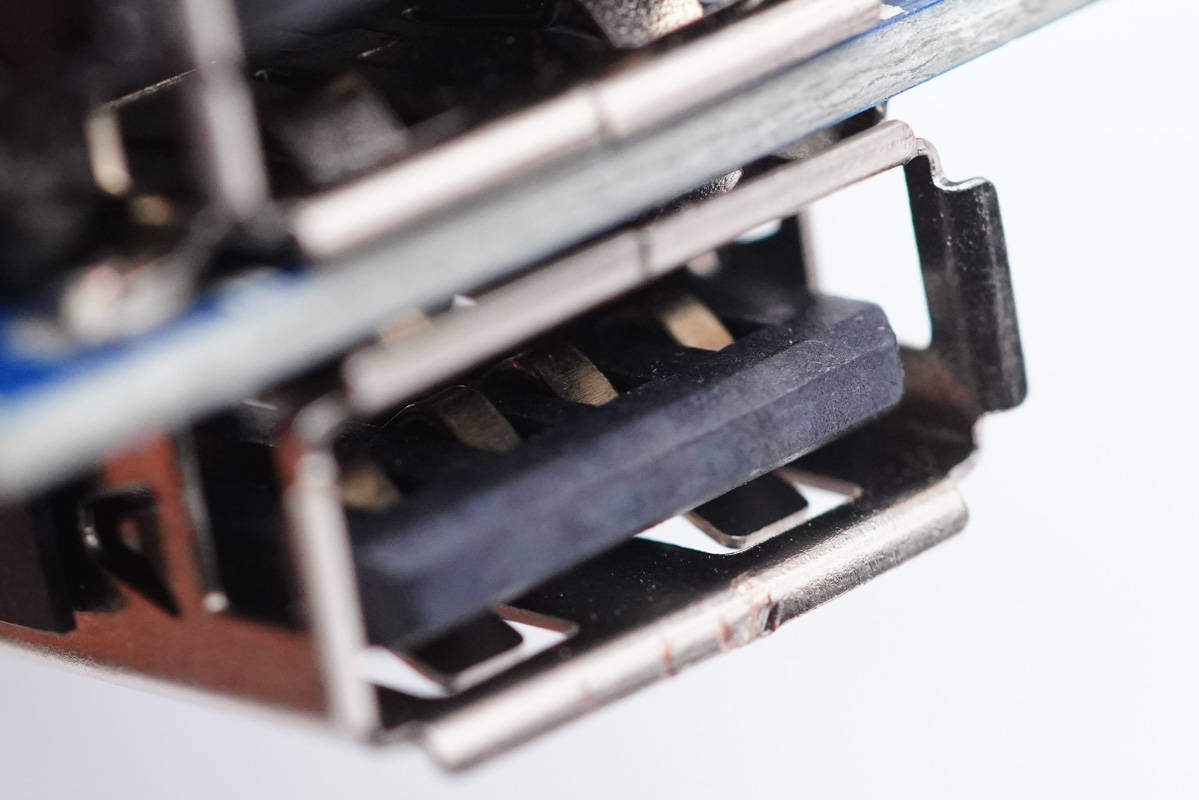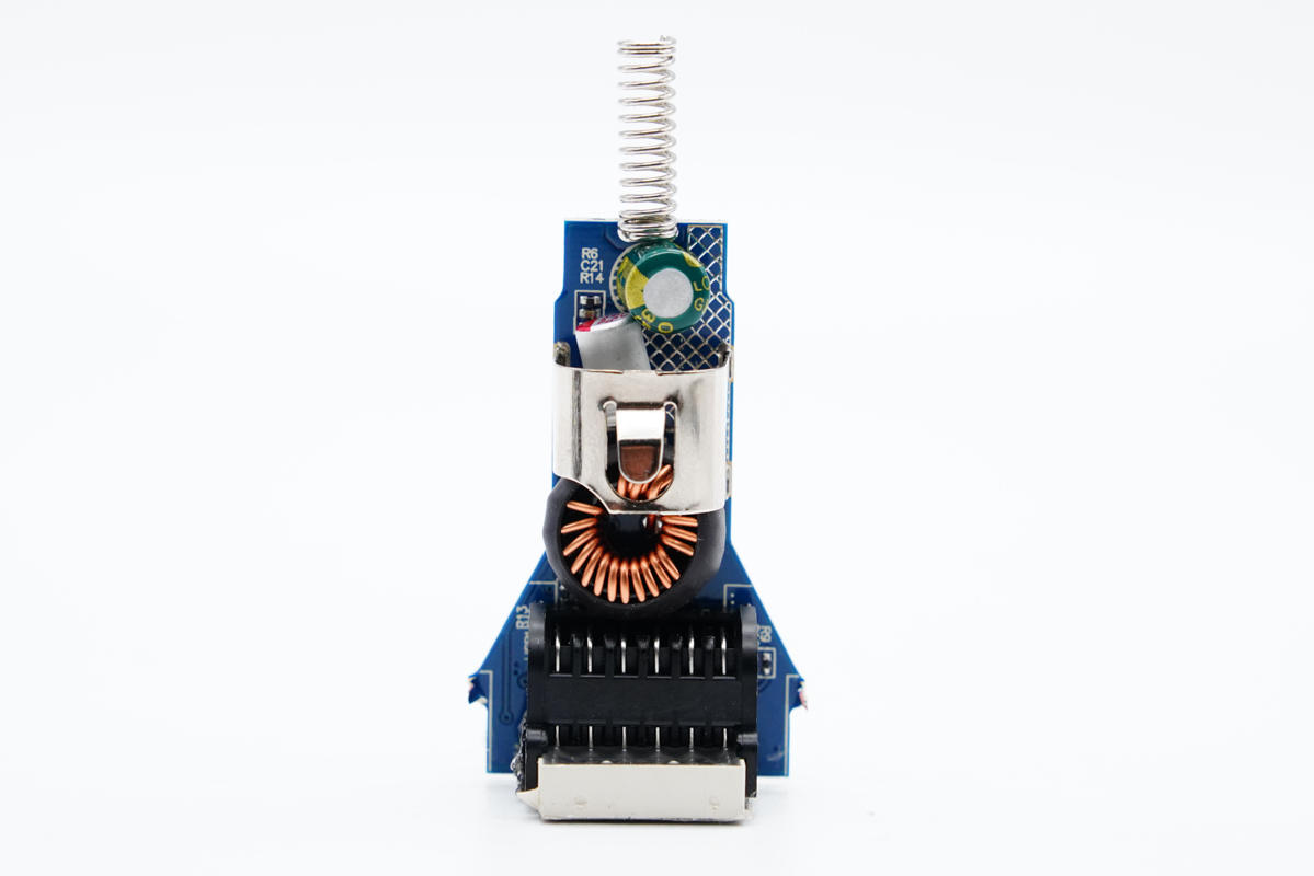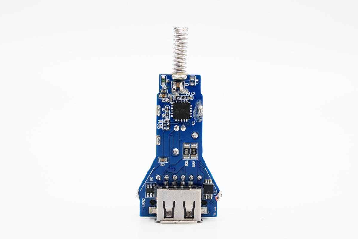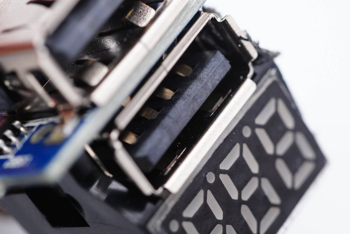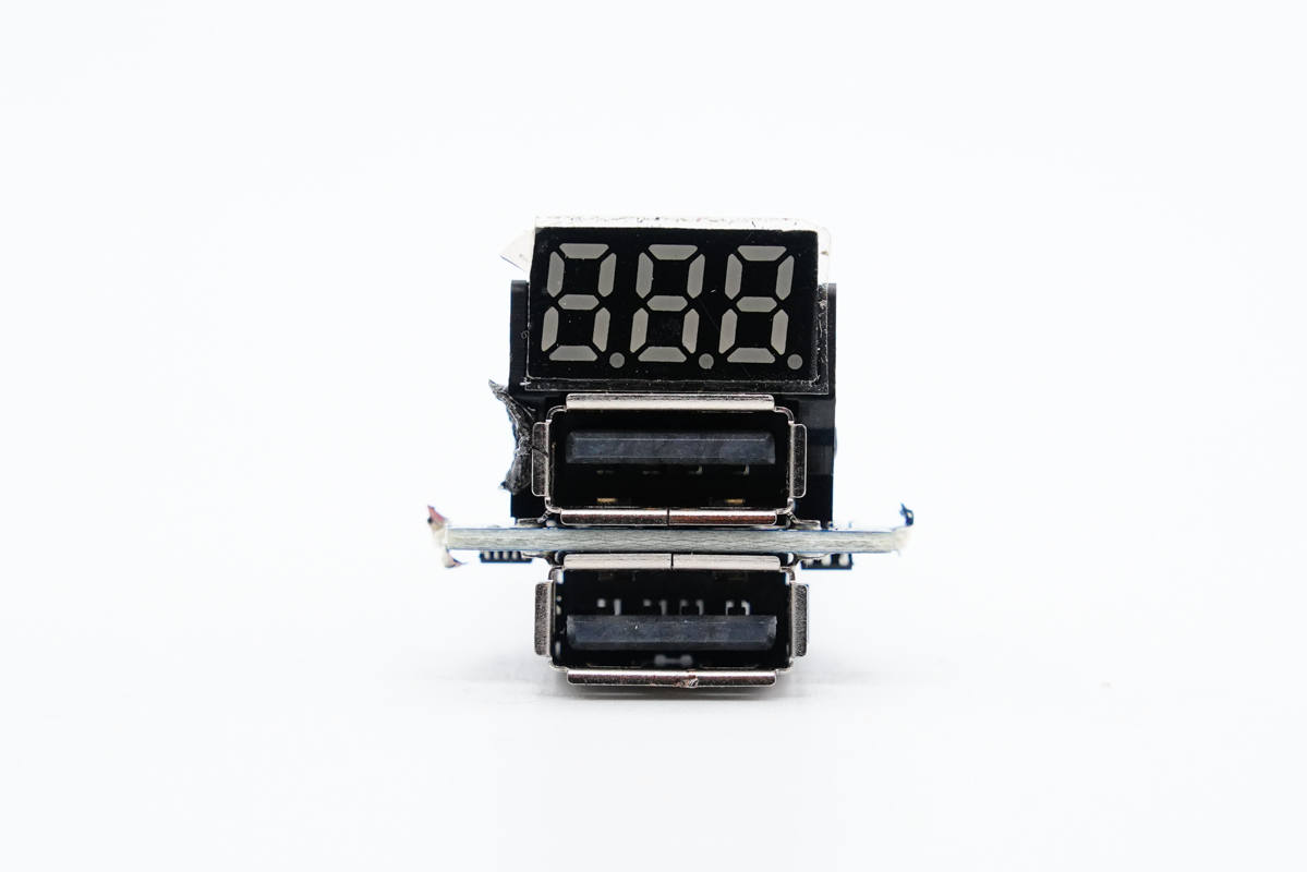 输出端两个USB母座焊接在主板两面,LED屏和母座之间有塑料隔离。