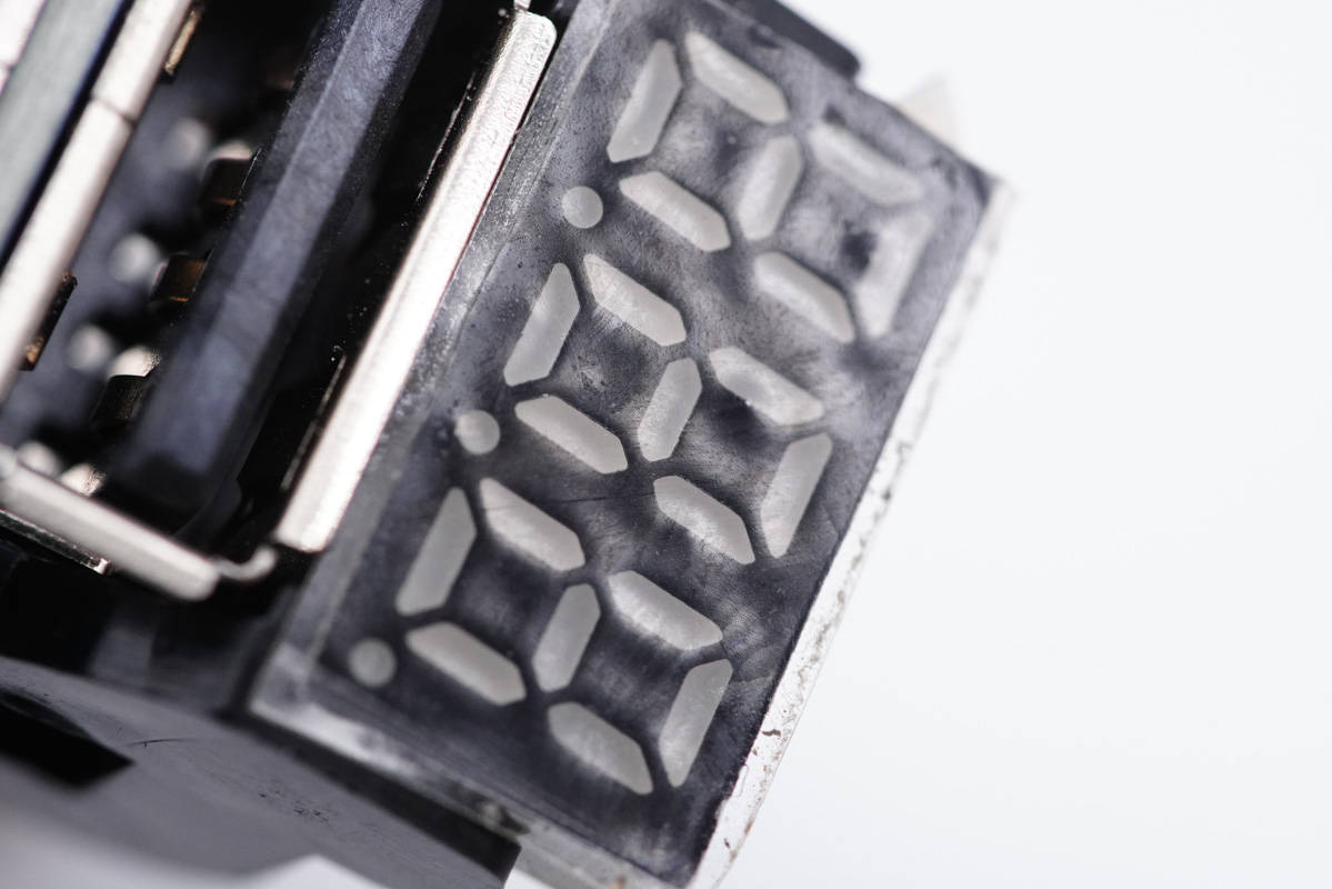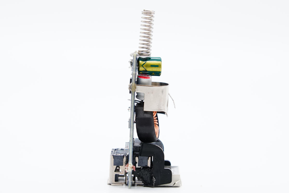 从侧面看去,负极金属片和PCB板锡焊,LED显示屏使用塑料支撑加固。