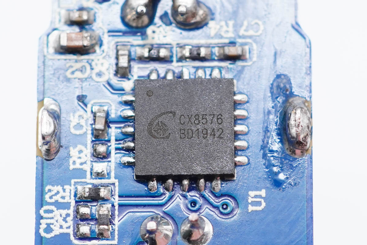 充电头网通过拆解了解到,这款车充内置诚芯微CX8576降压转换器,用于双A口降压输出,另外同样采用来自诚芯微的CX2901A,用于双A口充电协议识别,控制输出电压。车充设有输出滤波电容,显示屏有塑料支撑固定,采用诚芯微CX2811驱动,整体设计讲究。
