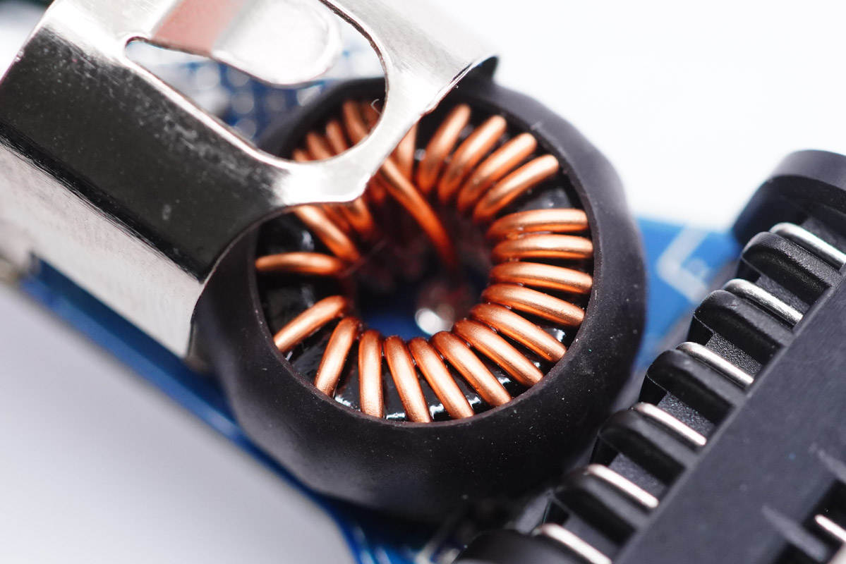 PCB板正面一览,使用输入输出滤波电容、降压电感。