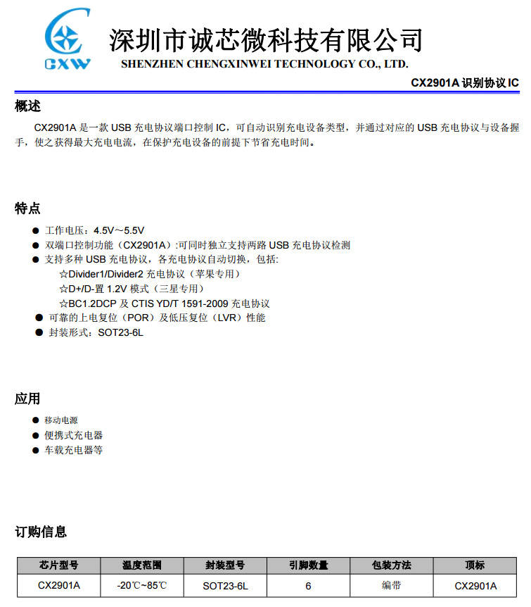 诚芯微CX2901A双路自动识别IC。这是一款USB充电协议端口控制IC,可自动识别充电设备类型,并通过对应的USB充电协议与设备握手,使之获得最大充电电流,在保护充电设备的前提下节省充电时间。