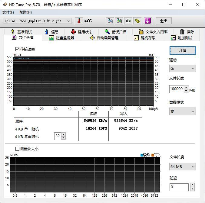 使用U盘、内存卡常用的ATTO Disk Benchmark软件按照不同文件大小进行跑分测试,致钛木星最大读取速度达到567.11MB/s,最大写入速度达到544.12MB/s,连续读取速度出色。