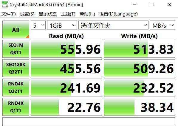 将致钛木星10移动固态硬盘通过USB4数据线连接到联想小新Pro14,然后使用CrystalDiskMark来对传输速度进行测试,大文件连续读取速度为555.96MB/s,连续写入速度为513.83MB/s。